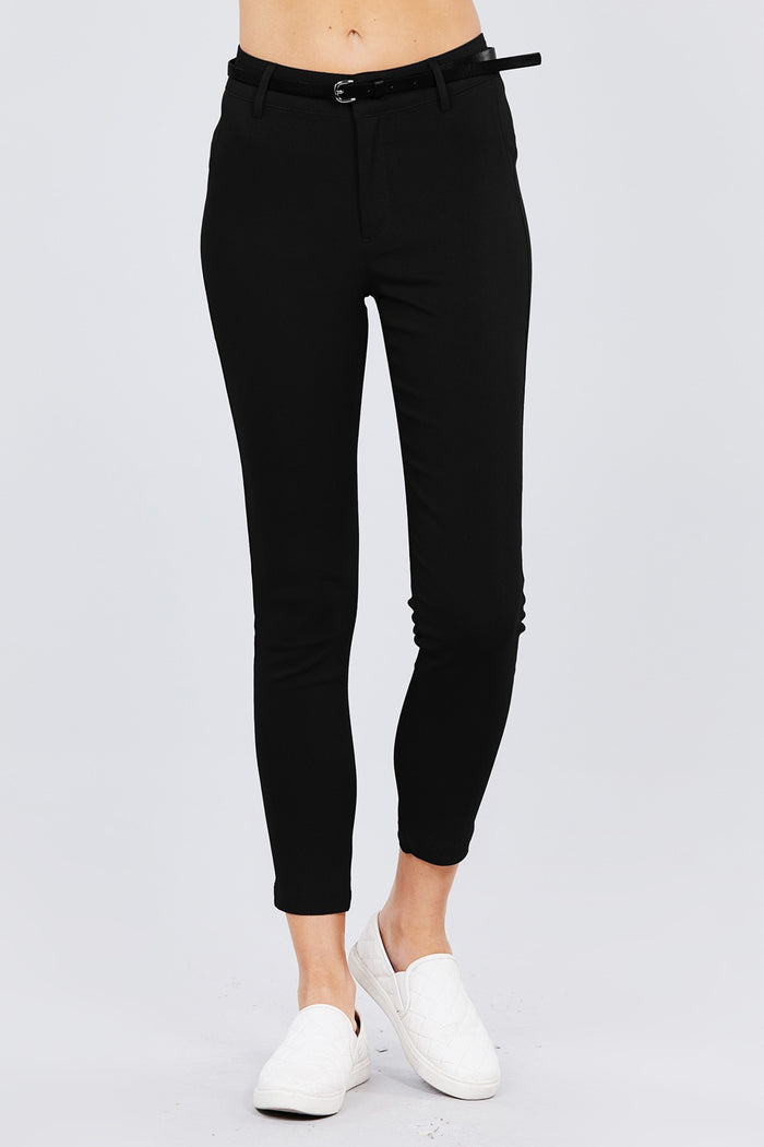 ImportedS.M.L.BENGALINE BELTED PANTS22% Nylon 74% Rayon 4% SpandexBlack ACT Bengaline Belted Pants Item Measurements: SIZE SMeasurements: SIZE SInseam:26" Length:37" Hips:26" Rise:12