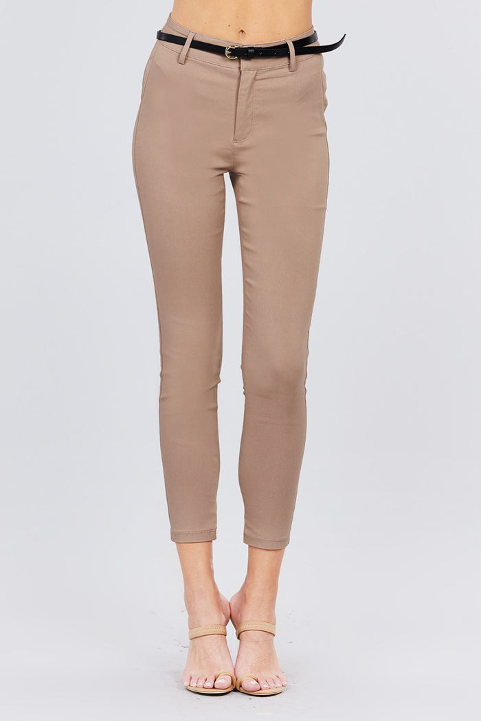 ImportedS.M.L.BENGALINE BELTED PANTS22% Nylon 74% Rayon 4% SpandexKhaki ACT Bengaline Belted Pants Item Measurements: SIZE SMeasurements: SIZE SInseam:26" Length:37" Hips:26" Rise:12