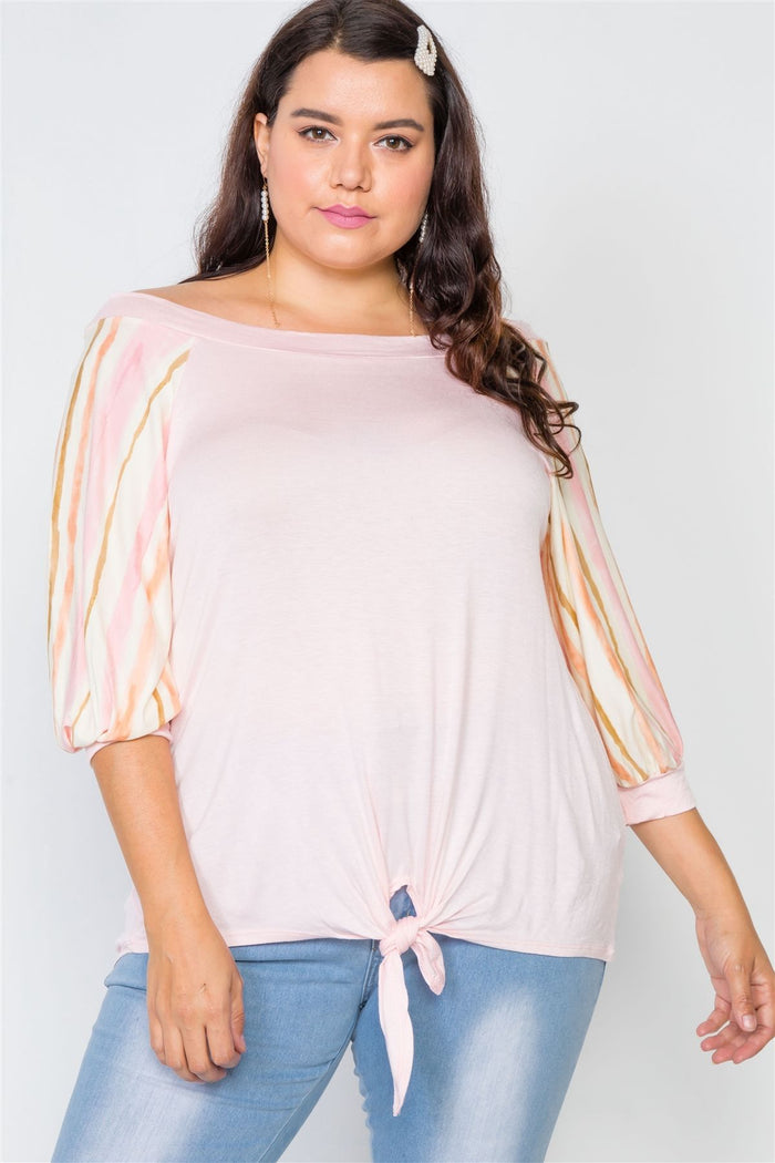 Made In U.S.A1XL.2XL.3XLscoop-neck, watercolor stripe design on sleeves, front knot on hem, unlined95% Polyester 5% SpandexPinkTSH Plus Size Pink Scoop-neck...