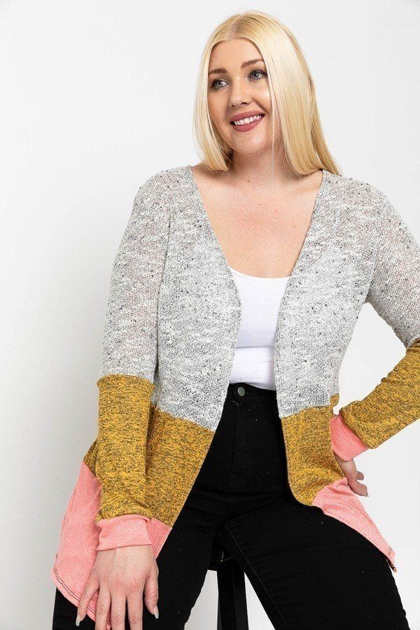 Made In U.S.A 1XL.2XL.3XL Color block, lightweight cardigan featuring three colored knits, an open front, and long sleeves. 33% Rayon...
