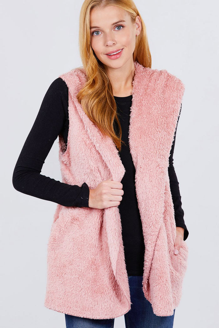 Imported S.M.L OPEN FRONT W/HOODIE FAUX FUR FLUFFY VEST 100% Polyester Pink ACT Faux Fur Fluffy Vest Item Measurements: SIZE S Measurements: SIZE...