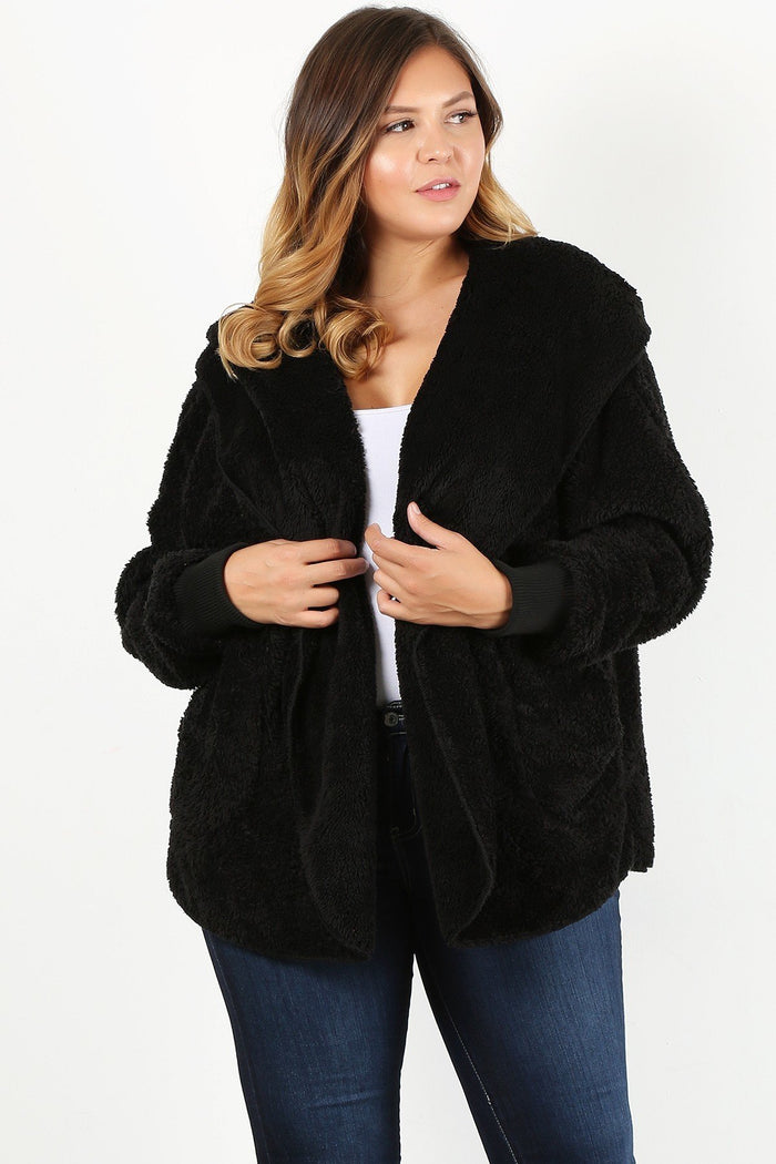 Imported 1XL.2XL.3XLPlus size faux fur teddy jacket, with open front, hoodie, side pockets, cuffed sleeves, and loose fit silhouette100% Polyester Black HAU Plus...