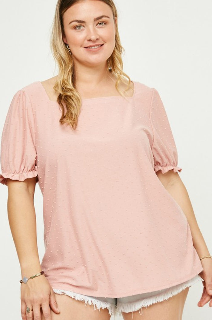 Voluminous puff sleeves boost the romance of this square neck knit top cut from dotted knit fabric. Plus size Dotted...