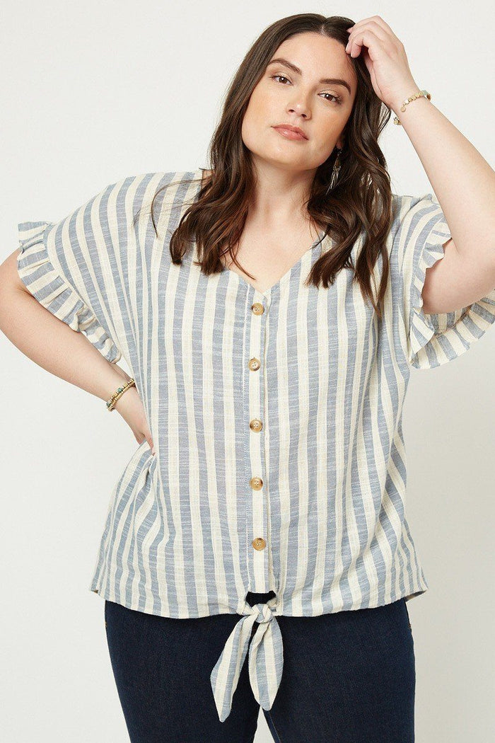 Imported 1XL.2XL.3XL *Stripe Linen Blend Fabric *Ruffle Neckline *Decorative Button-Down Detail *Front Tie-Front Hemline 96% Nylon 4% Spandex Blue HLA...