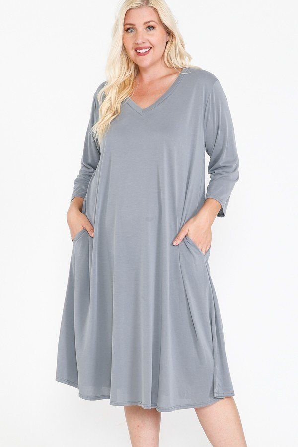 Imported 1XL.2XL.3XL V NECK HIDDEN POCKET SWING DRESS 23% Polyester 77% Modal Grey RKA V Neck Hidden Pocket Swing Dress...