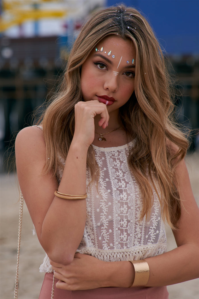 Imported S.M.L. cropped length, lace crochet sheer, sleeveless, bohemian look, fringe hem. 70% Cotton 30% Polyester Ivory TSH Ivory Bohemian...