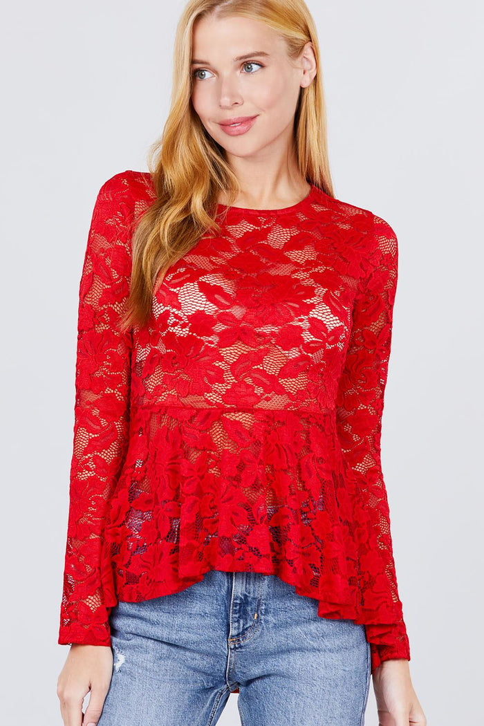 ImportedS.M.L.LONG SLEEVE ROUND NECK PEPLUM LACE TOP92% Nylon 8% SpandexRed ACT Long Sleeve Round Neck Peplum Lace Top Measurements: SIZE SLength:27" Waist:28"...