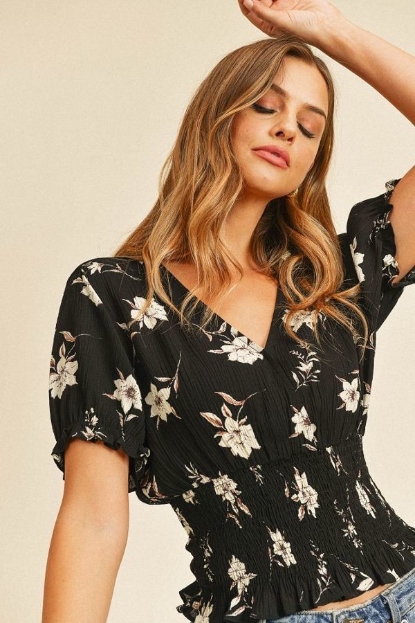 Imported XS.S.M.L Surplice neckline. Puff short sleeves. Smocked waist detail. Floral print 100% Rayon Black/Cream PAP Puff Sleeve Smocked Waist Surplice Top Item Measurements: SIZE...