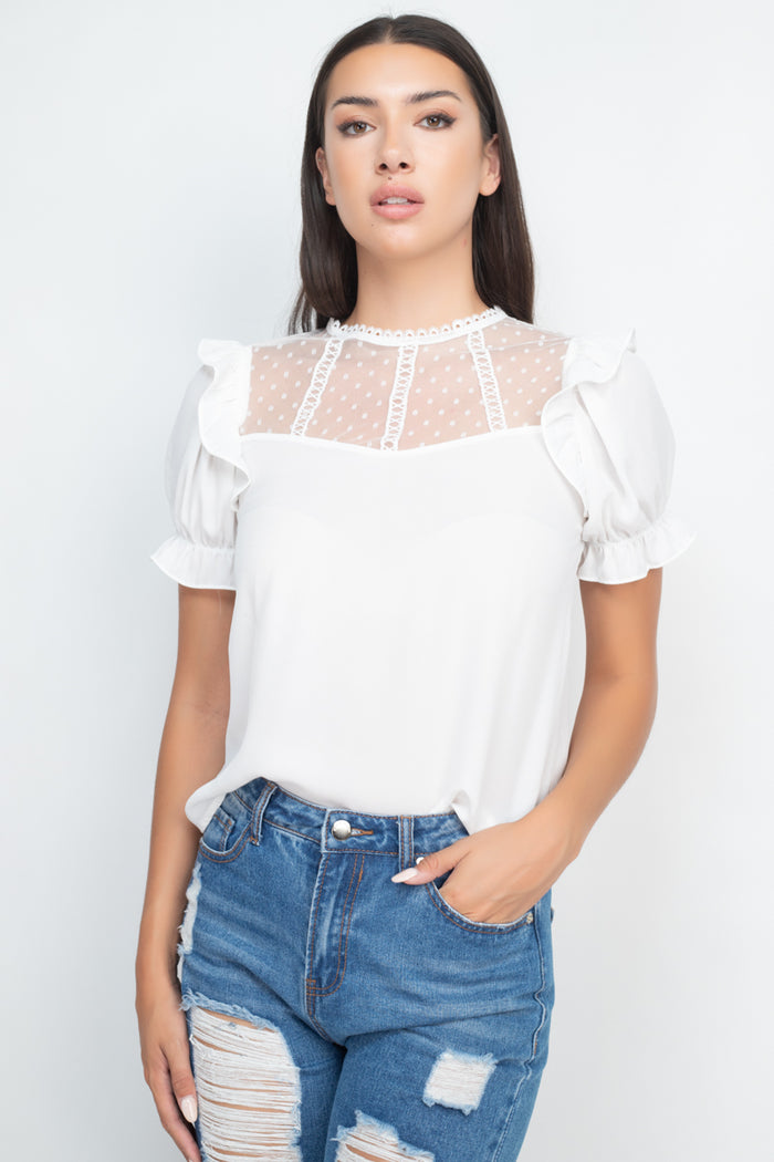 Imported S.M.L A solid top featuring a mock neckline, mesh dot design, ruffled-trim details, short puff sleeves, keyhole, snap button...
