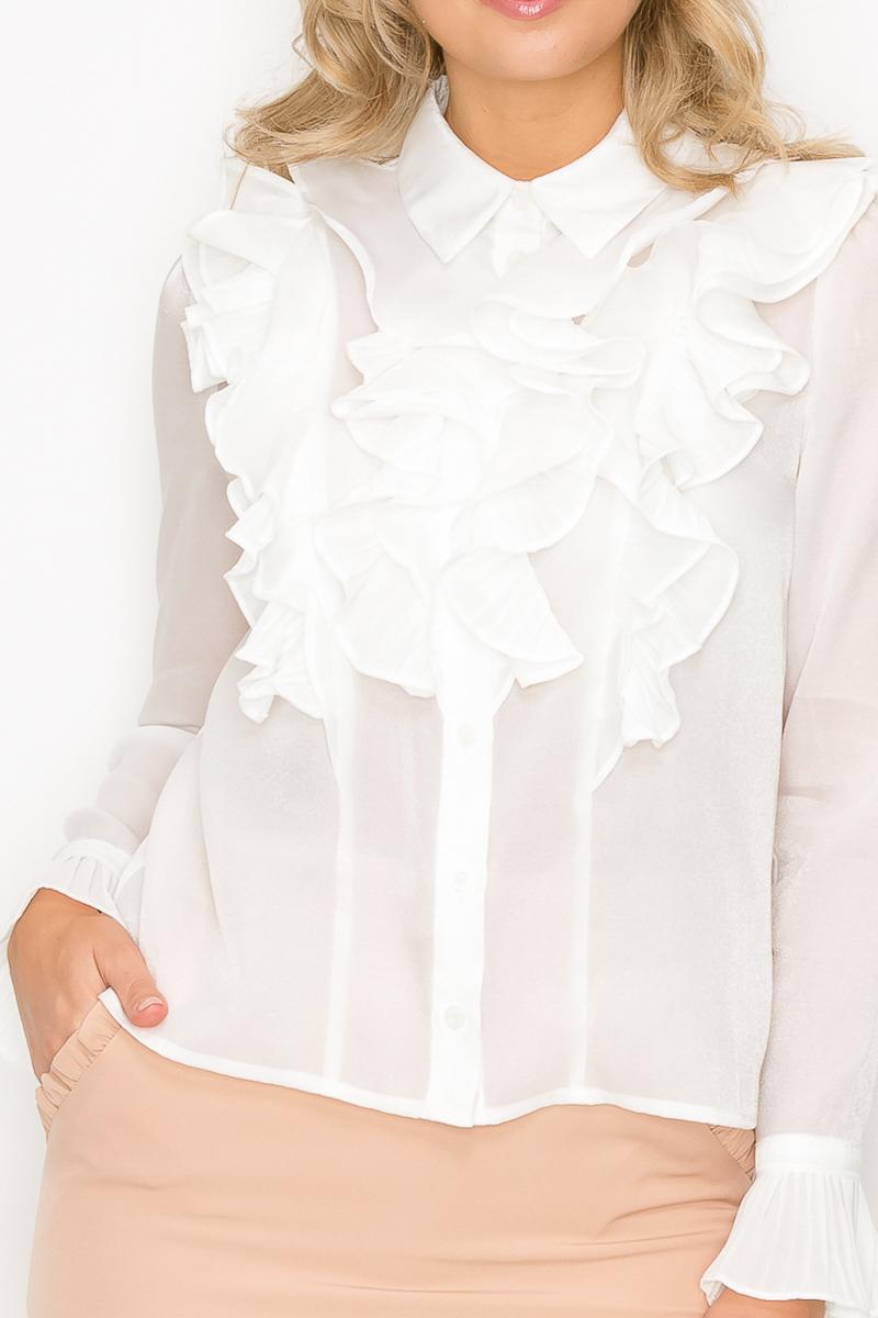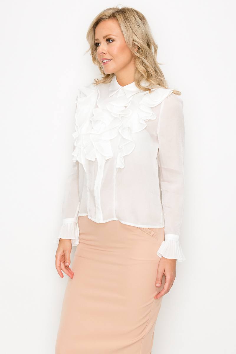 A woven blouse featuring a solid color, ruffle trim, long sleeves, a button down front, and a basic collar.