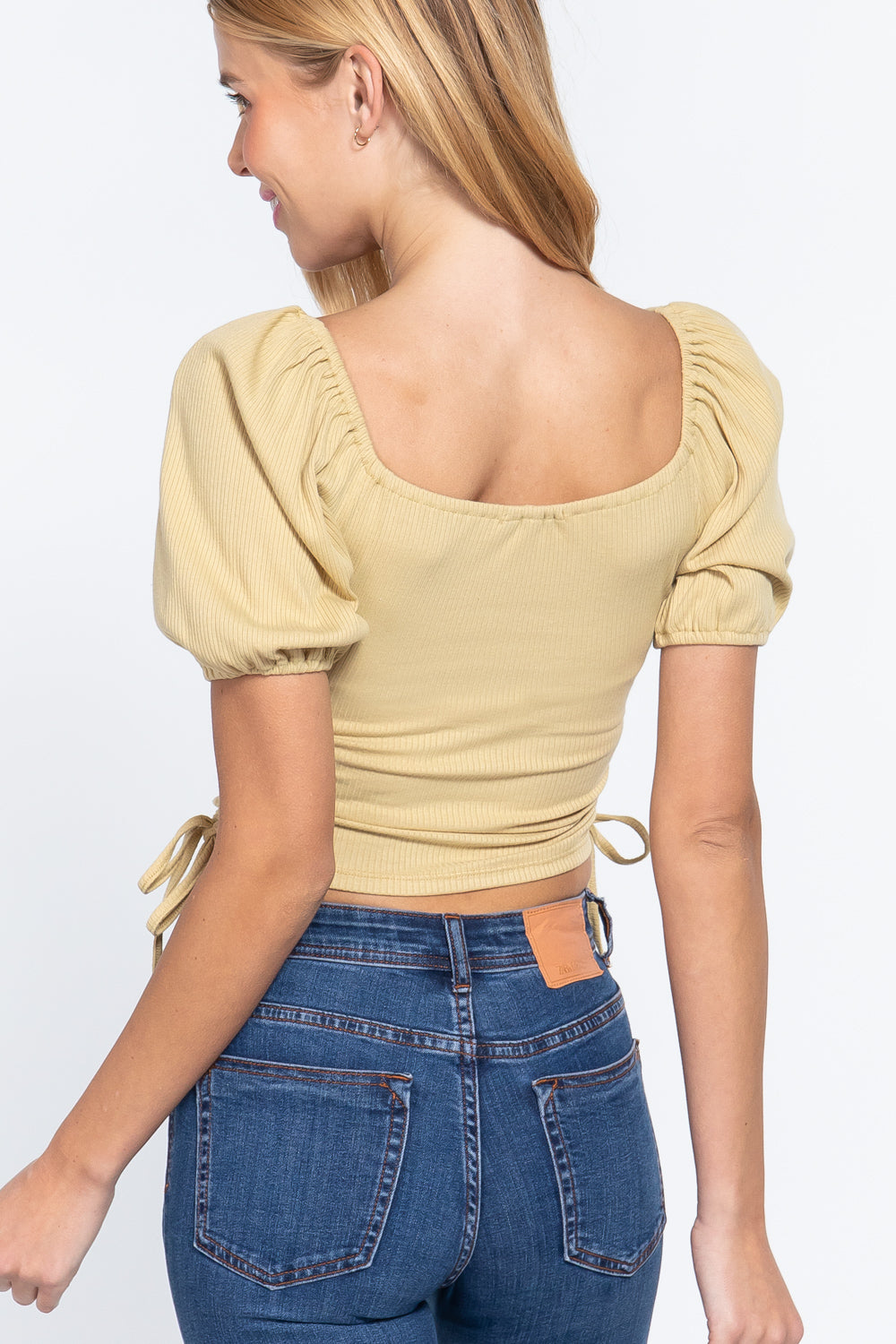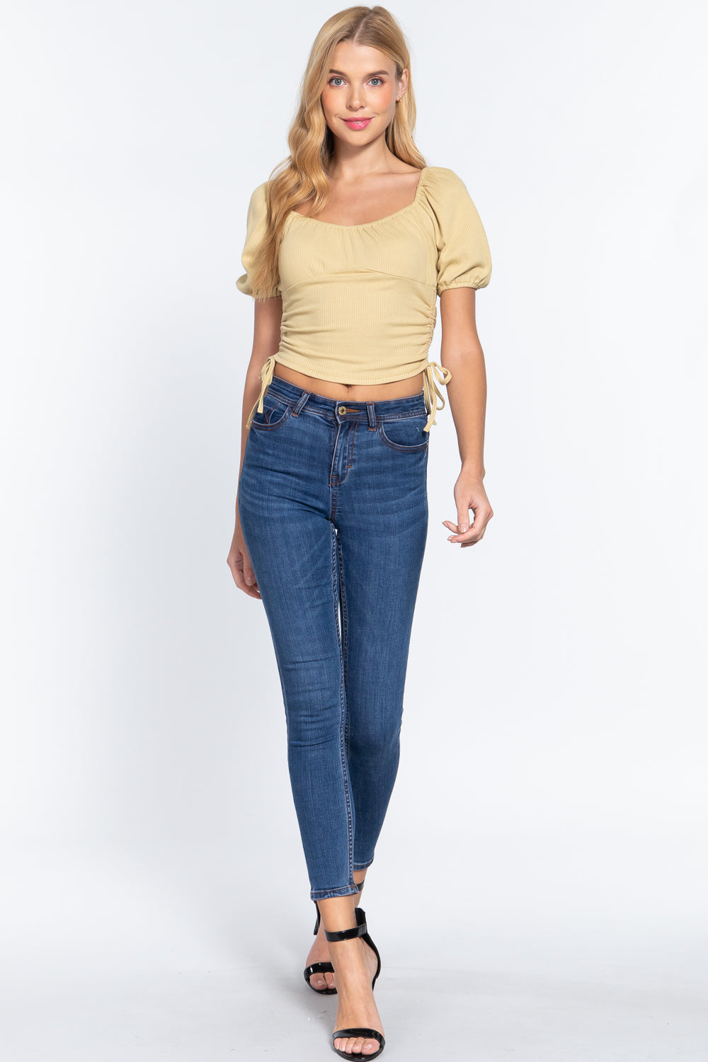Puff Slv Side Shirring Rib Knit Top