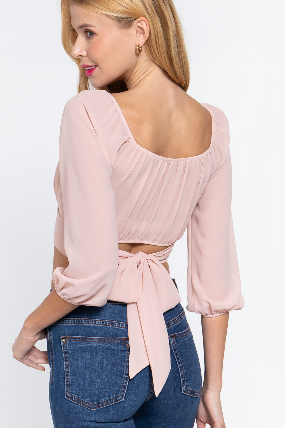 3/4 SLEEVE SWEET HEART NECK WAIST TIE DETAIL CROP WOVEN TOP