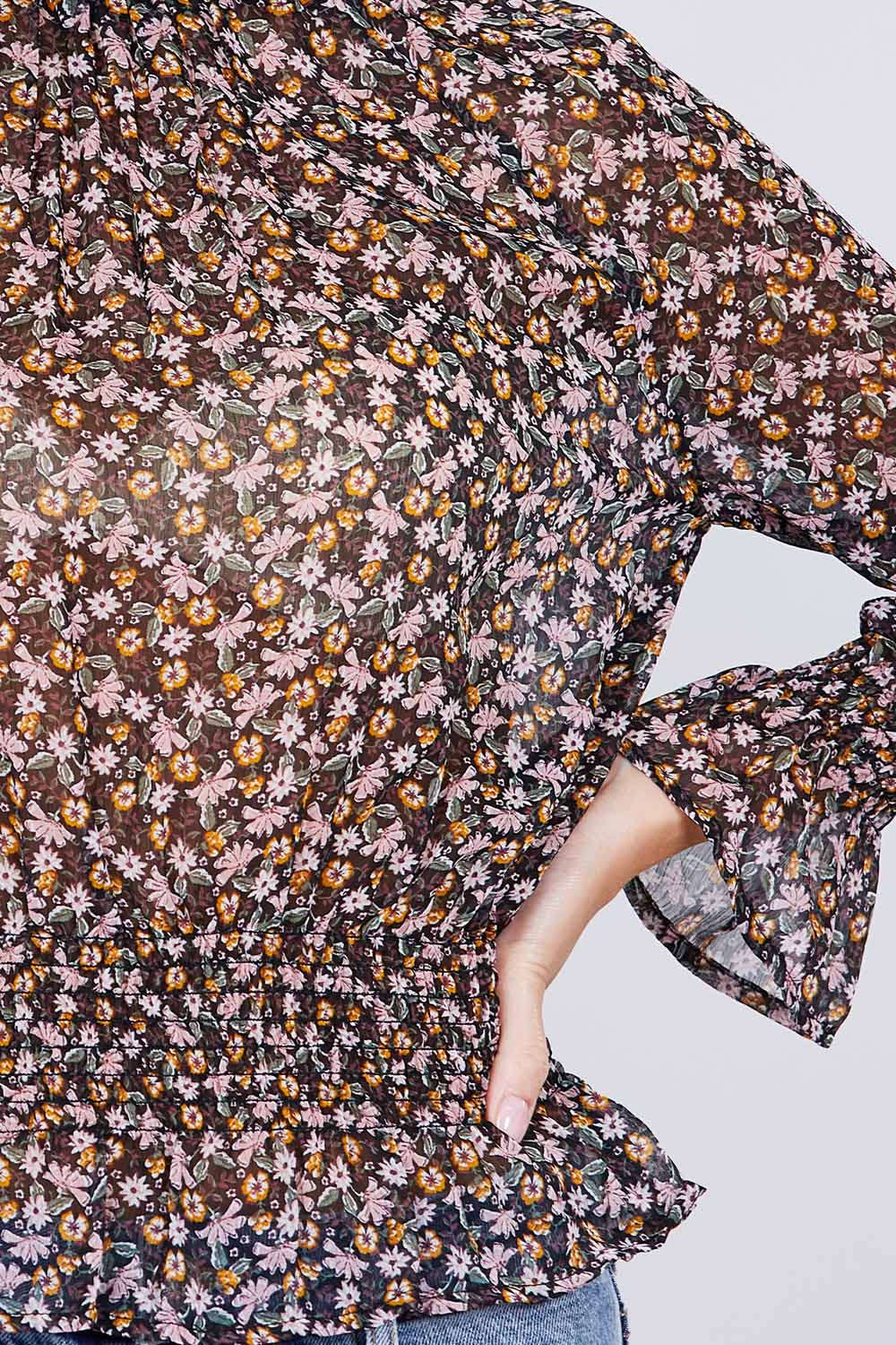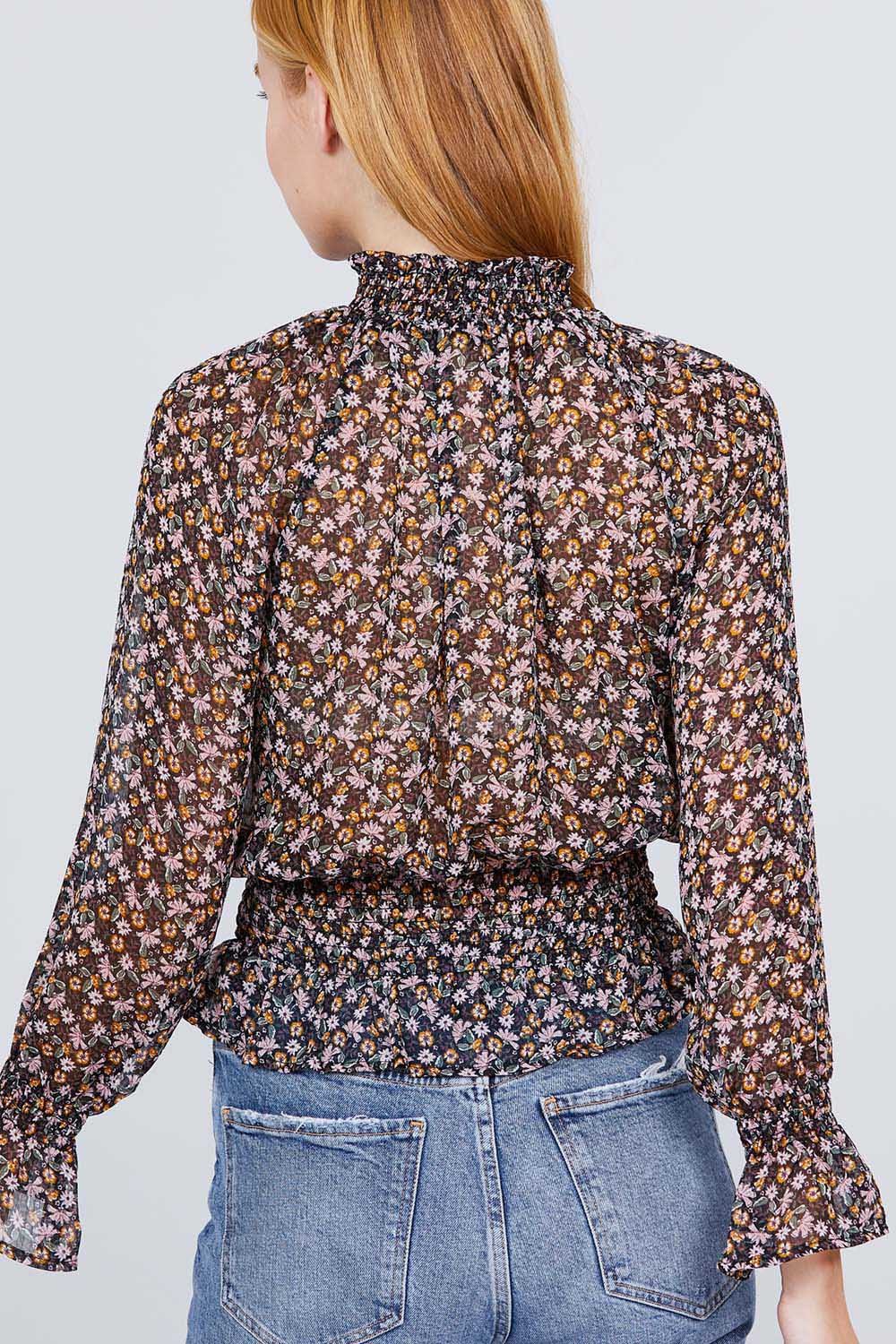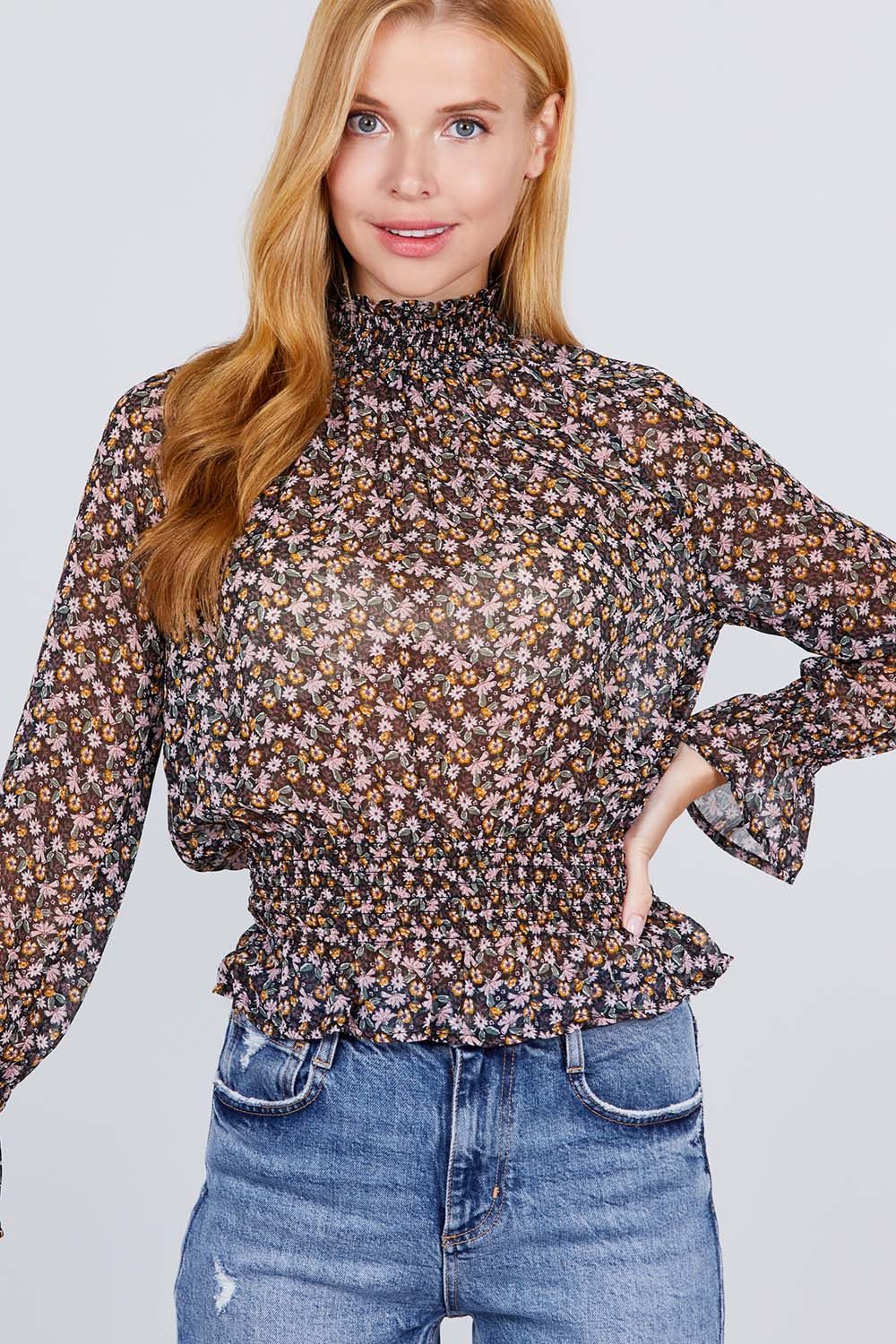 LONG RUFFLED RAGLAN SLEEVE MOCK NECK SMOCKED DETAIL PRINT WOVEN TOP