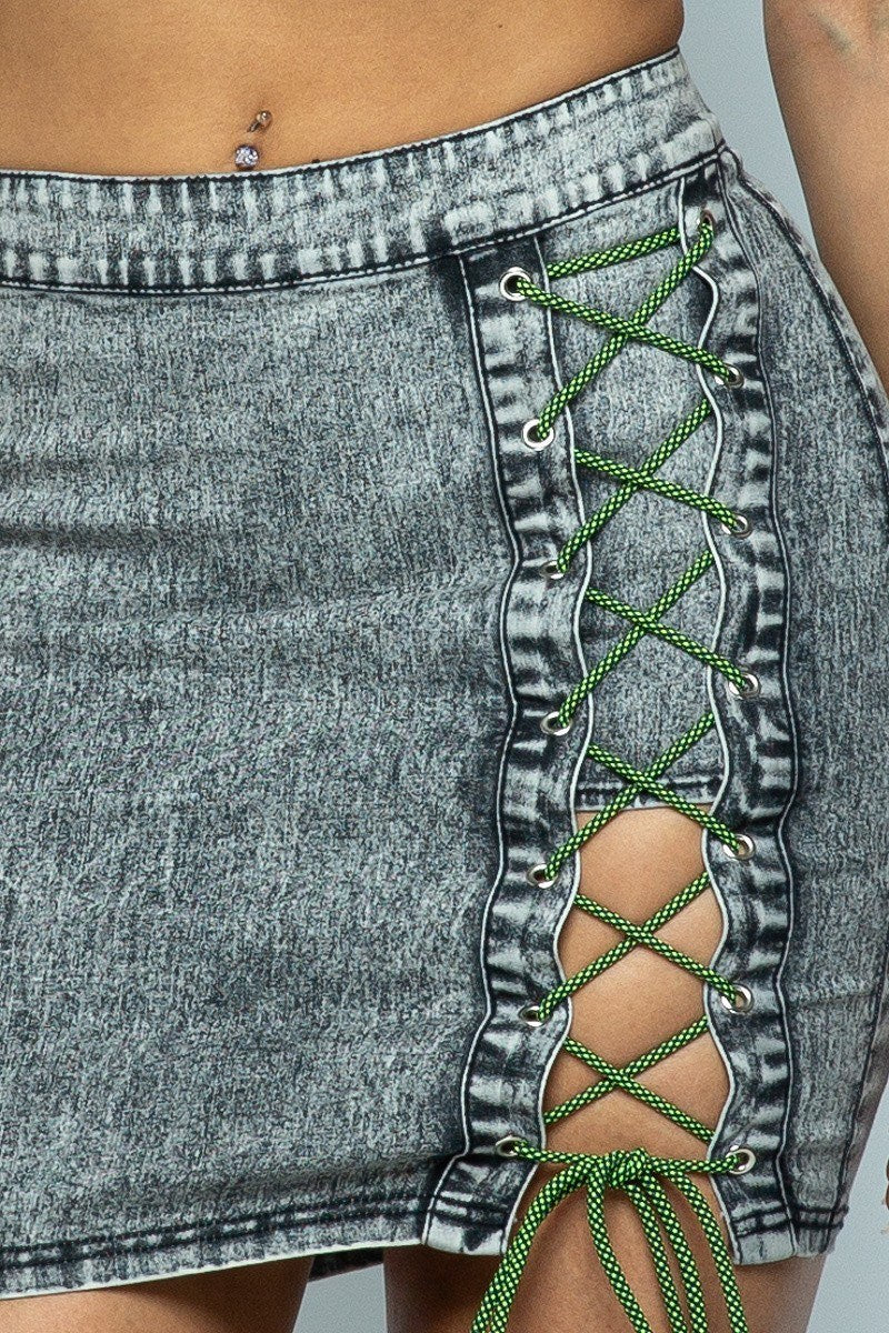 Stretchable Denim High-Waist Skirt With String Details & Center Back Open Zippered