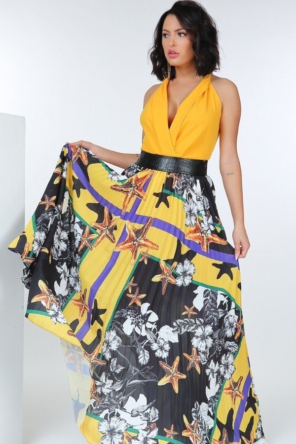 PLEATED PRINT MAXI SKIRT WITH LEATHER WAIST BAND