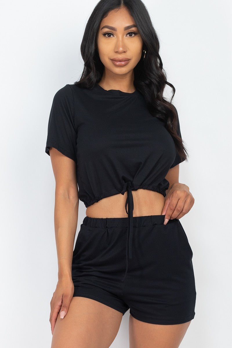 Adjustable front tied crop top & shorts casual summer sets. Stretch knit. Short Sleeve. Solid