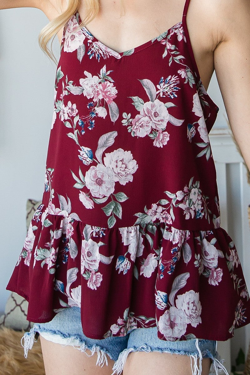 This cute floral spaghetti strap tank top features a tiered ruffled design. Stay stylish, light, and comfortable in this adorable tank top