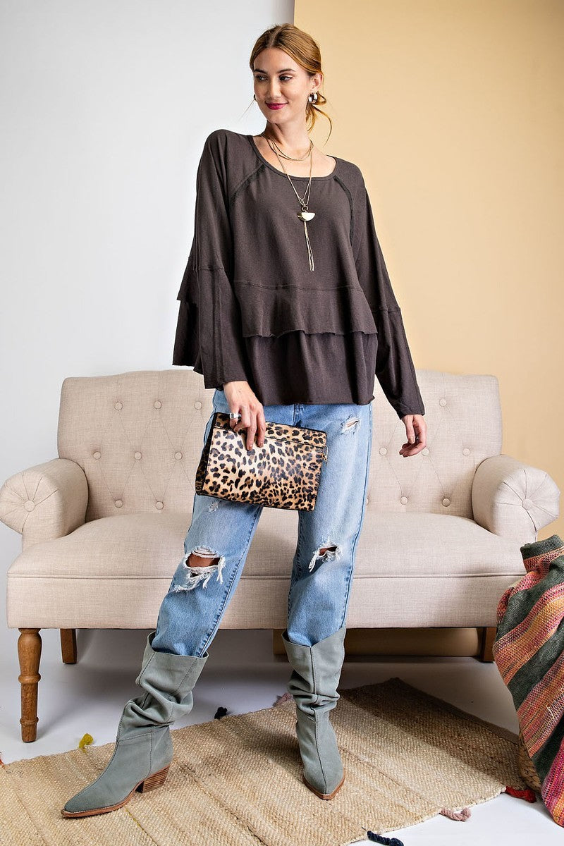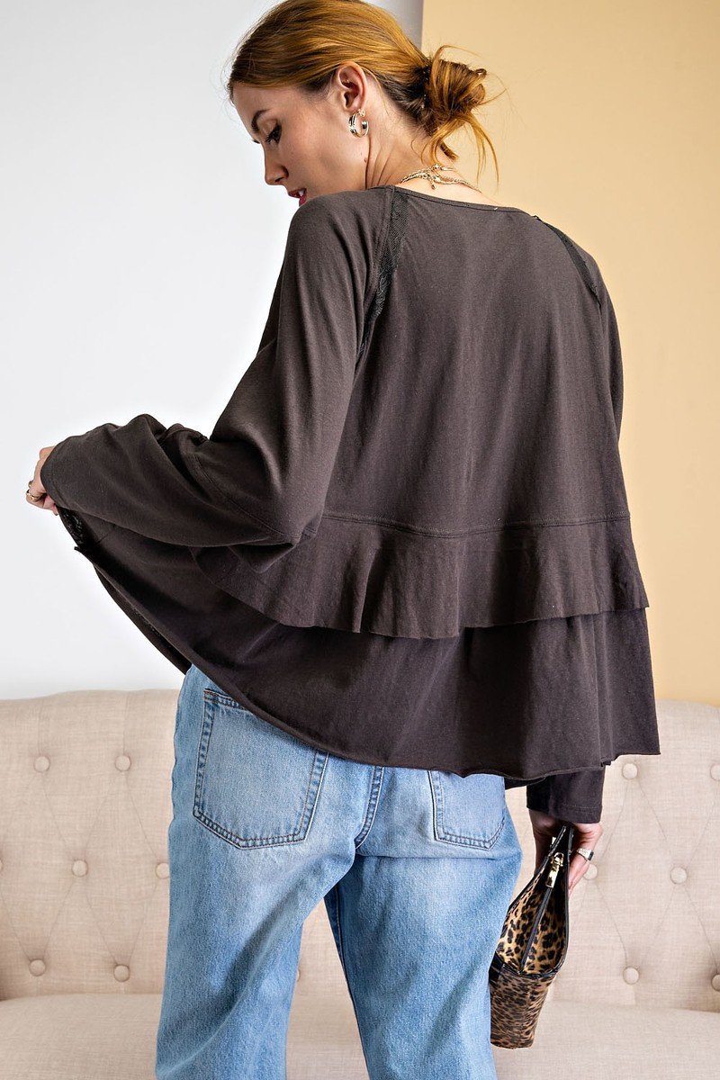 ROUNDED NECKLINE. DOLAM LONG SLEEVES. TIERED RUFFLE BOTTOM HEM