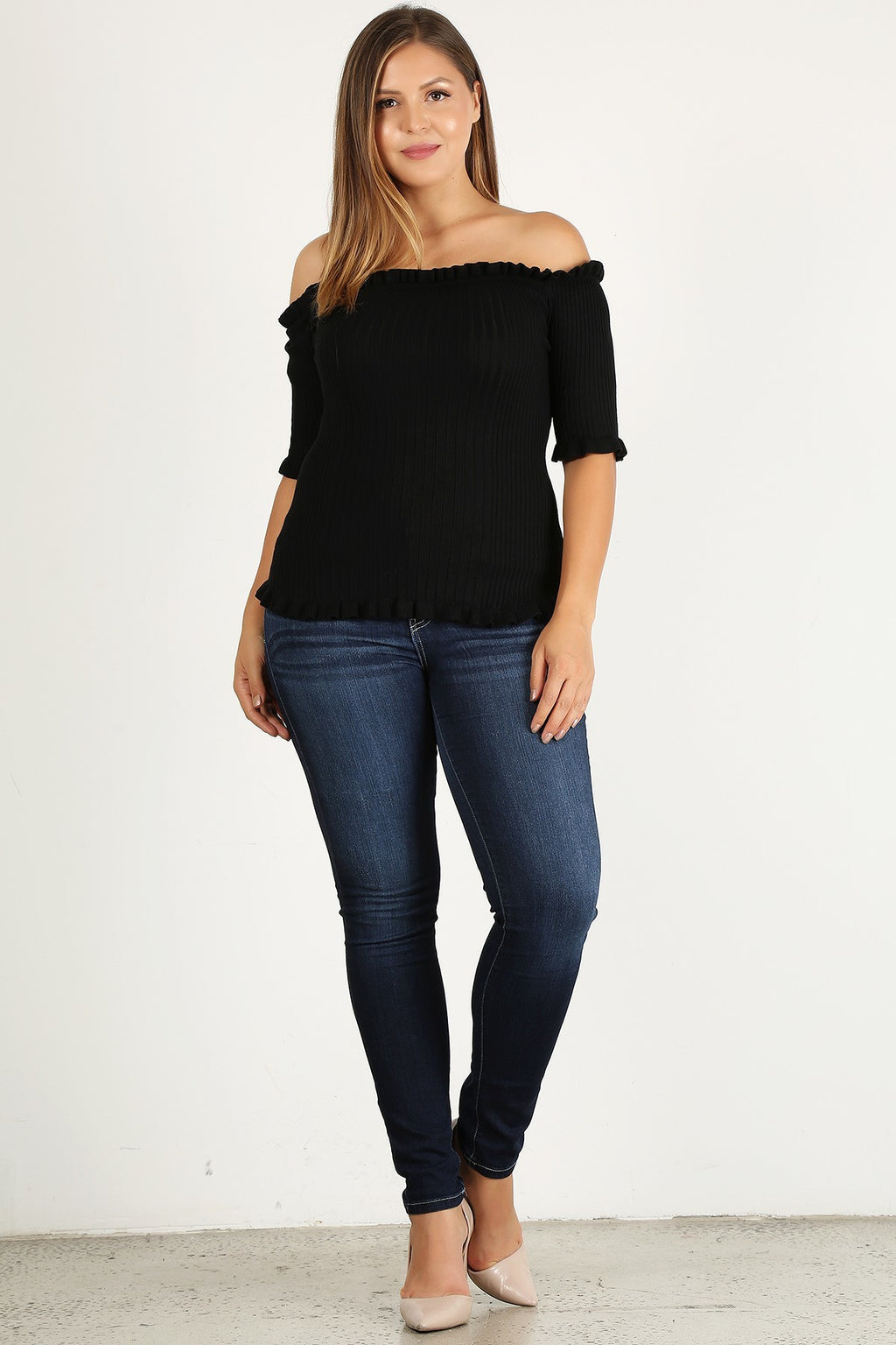 Plus size rib knit off shoulder short sleeve top with a frill trim
