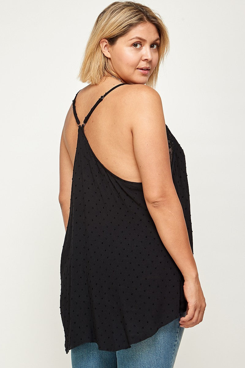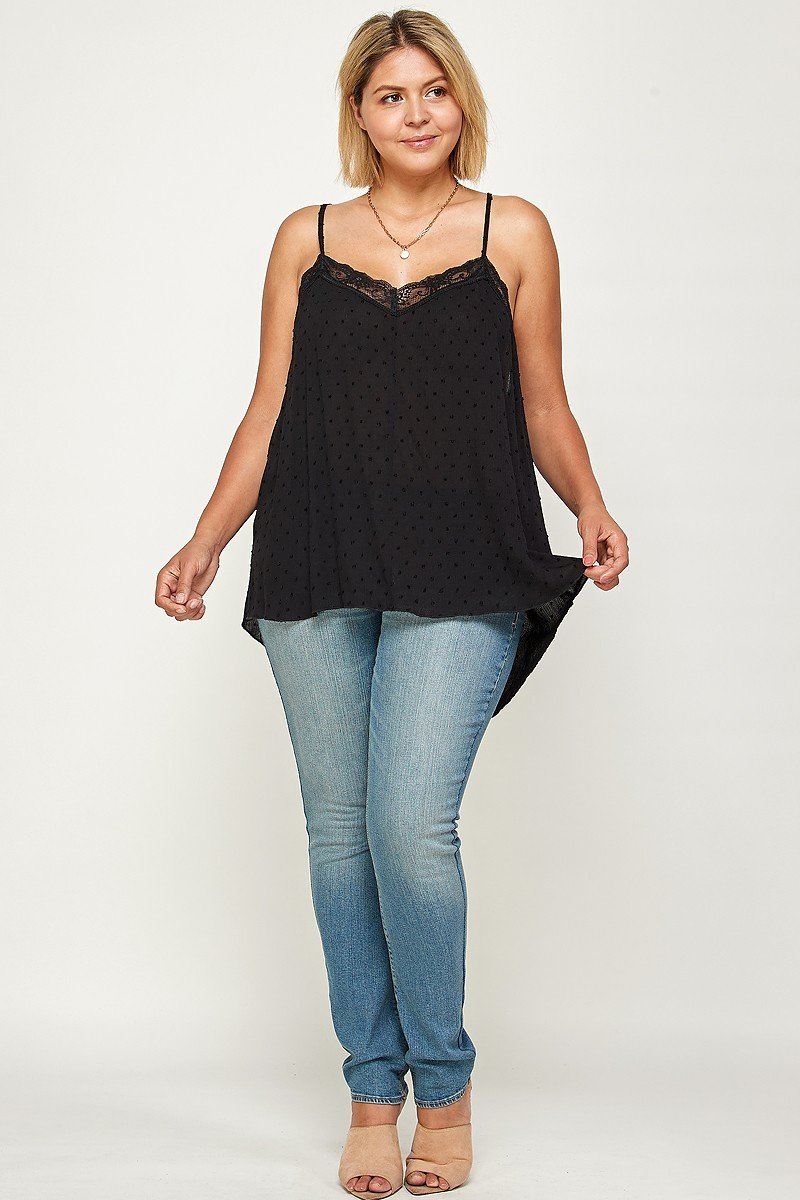 Plus size, clip dot solid cami tunic, with lace trim neckline, adjustable straps, and hi-low hem