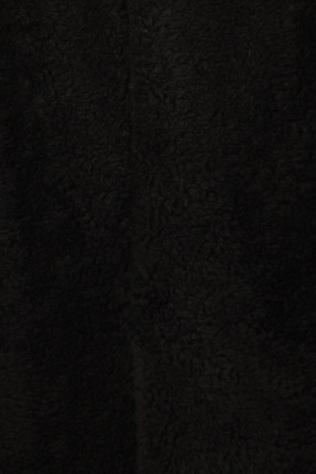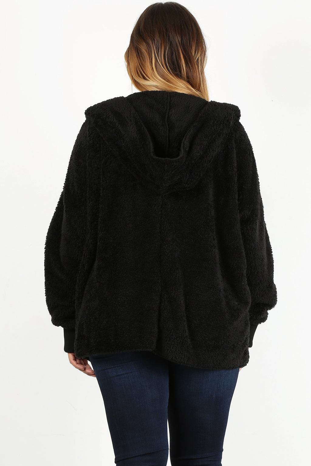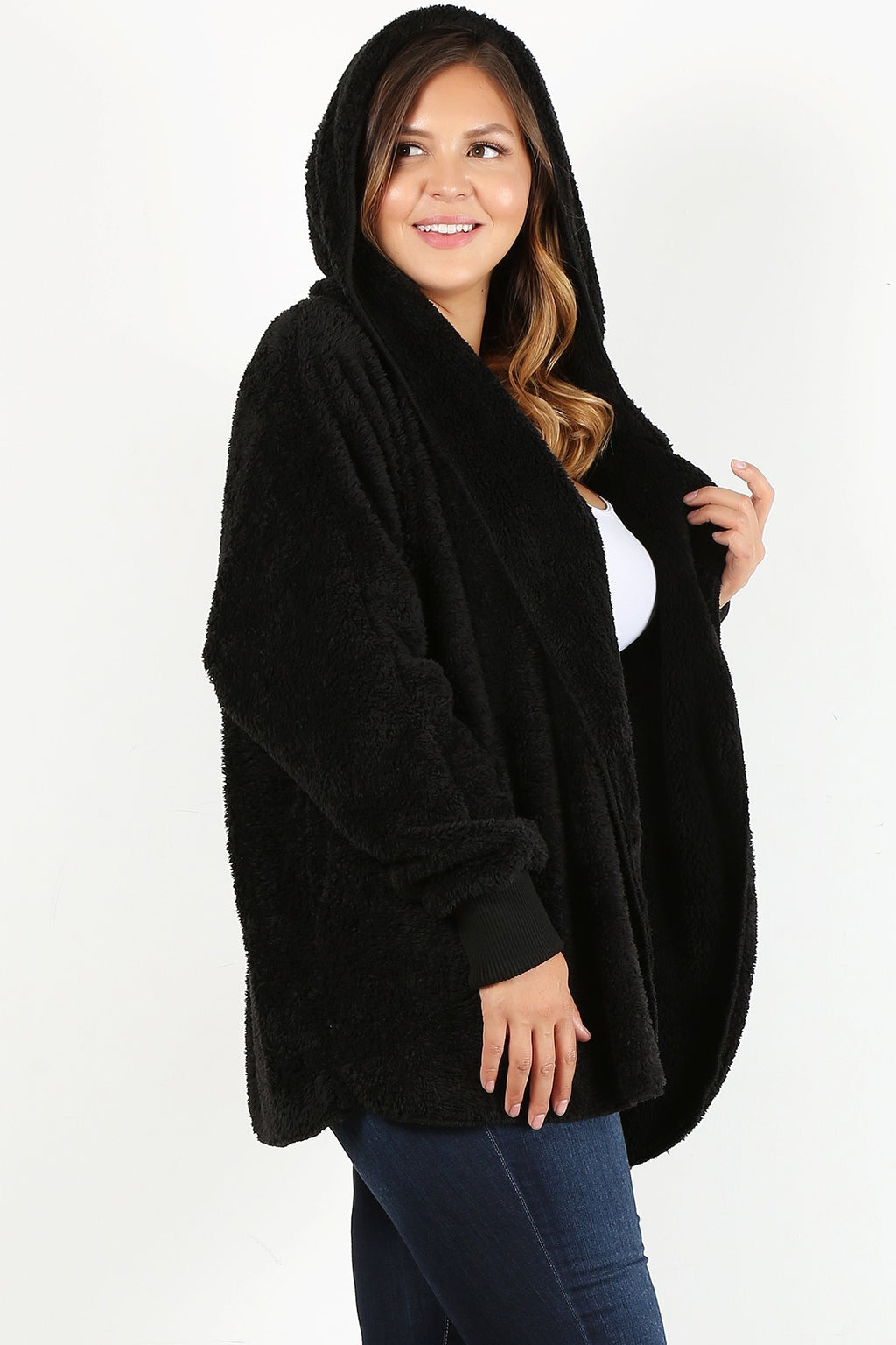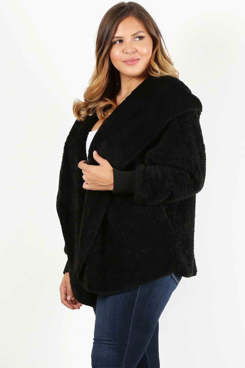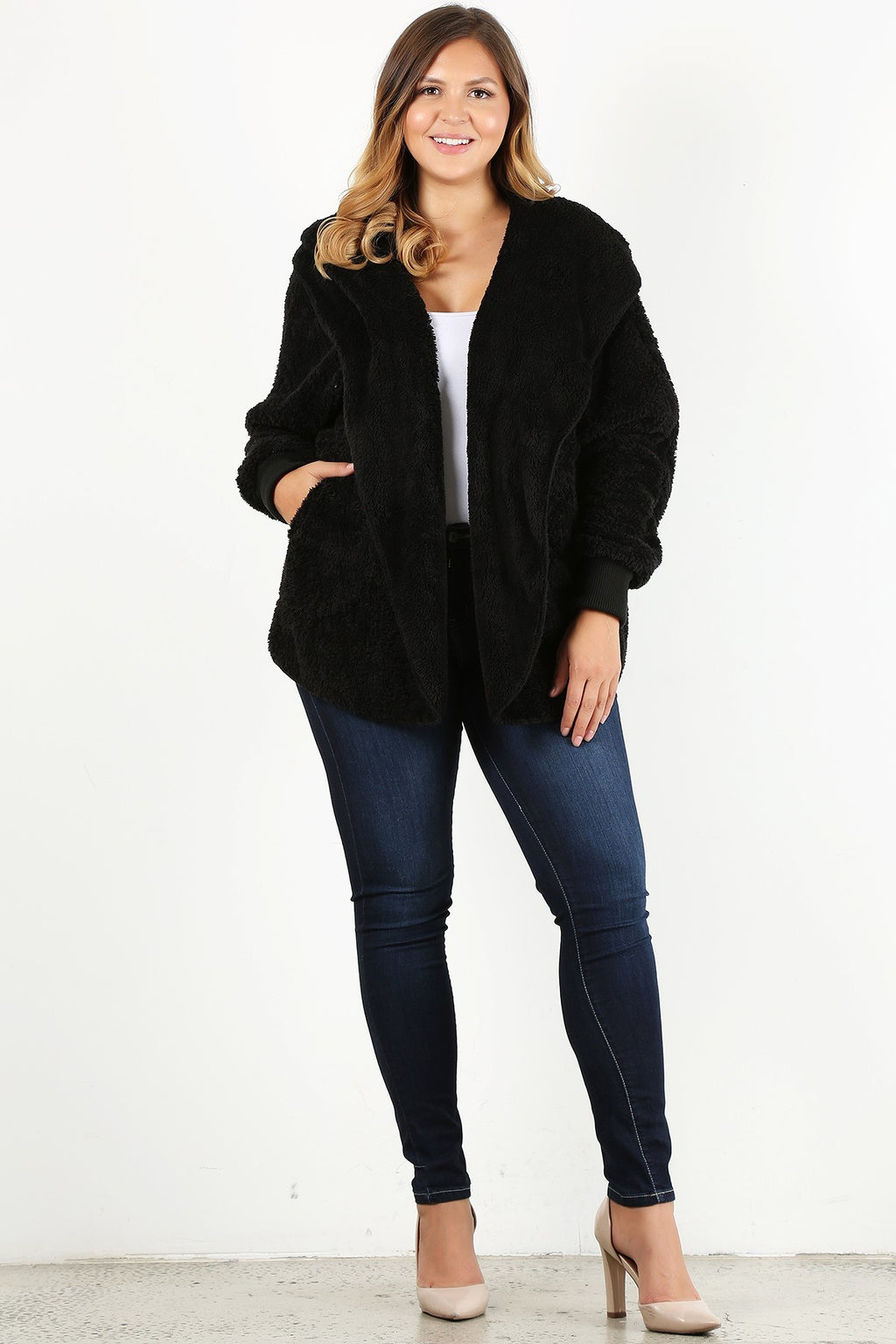 Plus size faux fur teddy jacket, with open front, hoodie, side pockets, cuffed sleeves, and loose fit silhouette