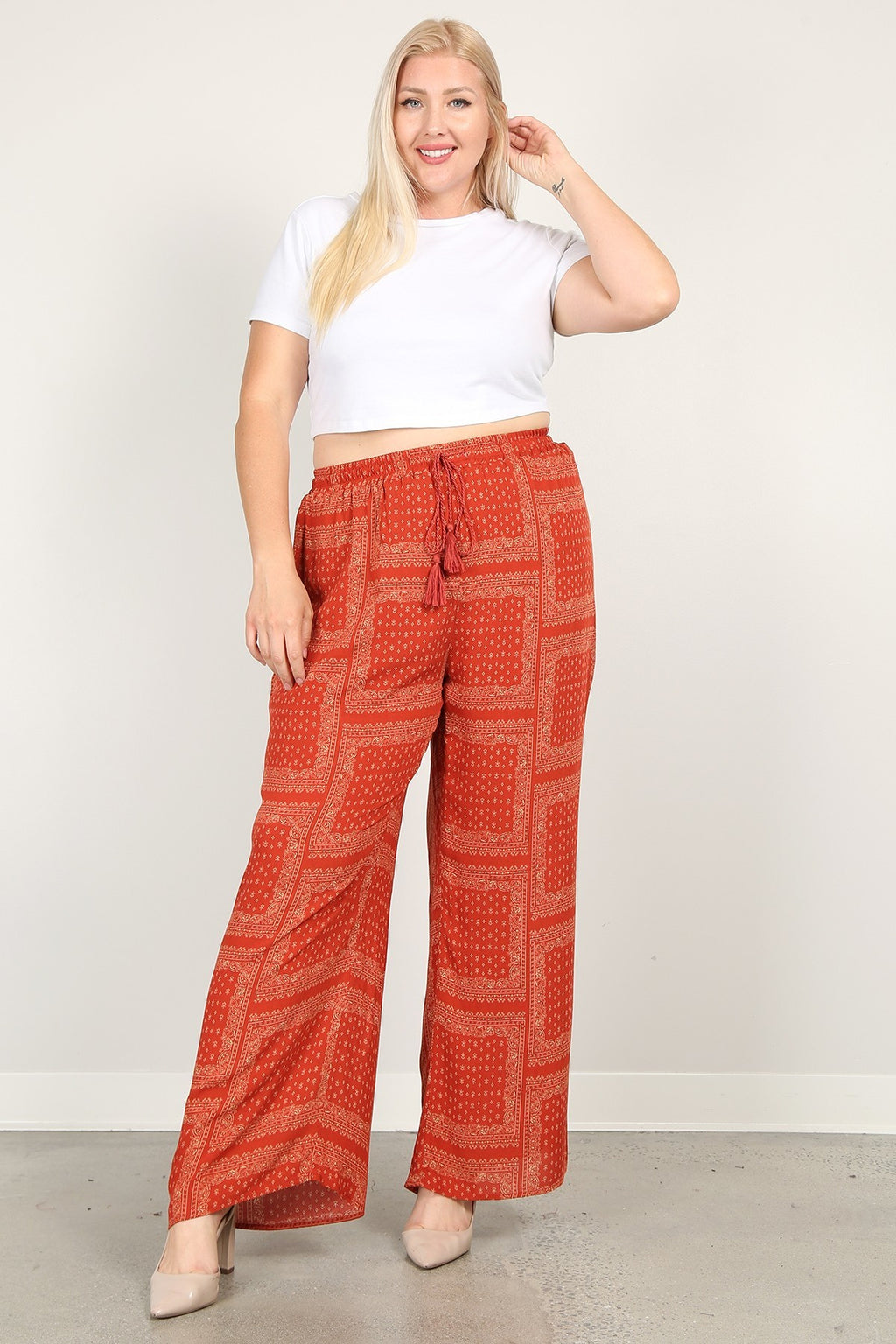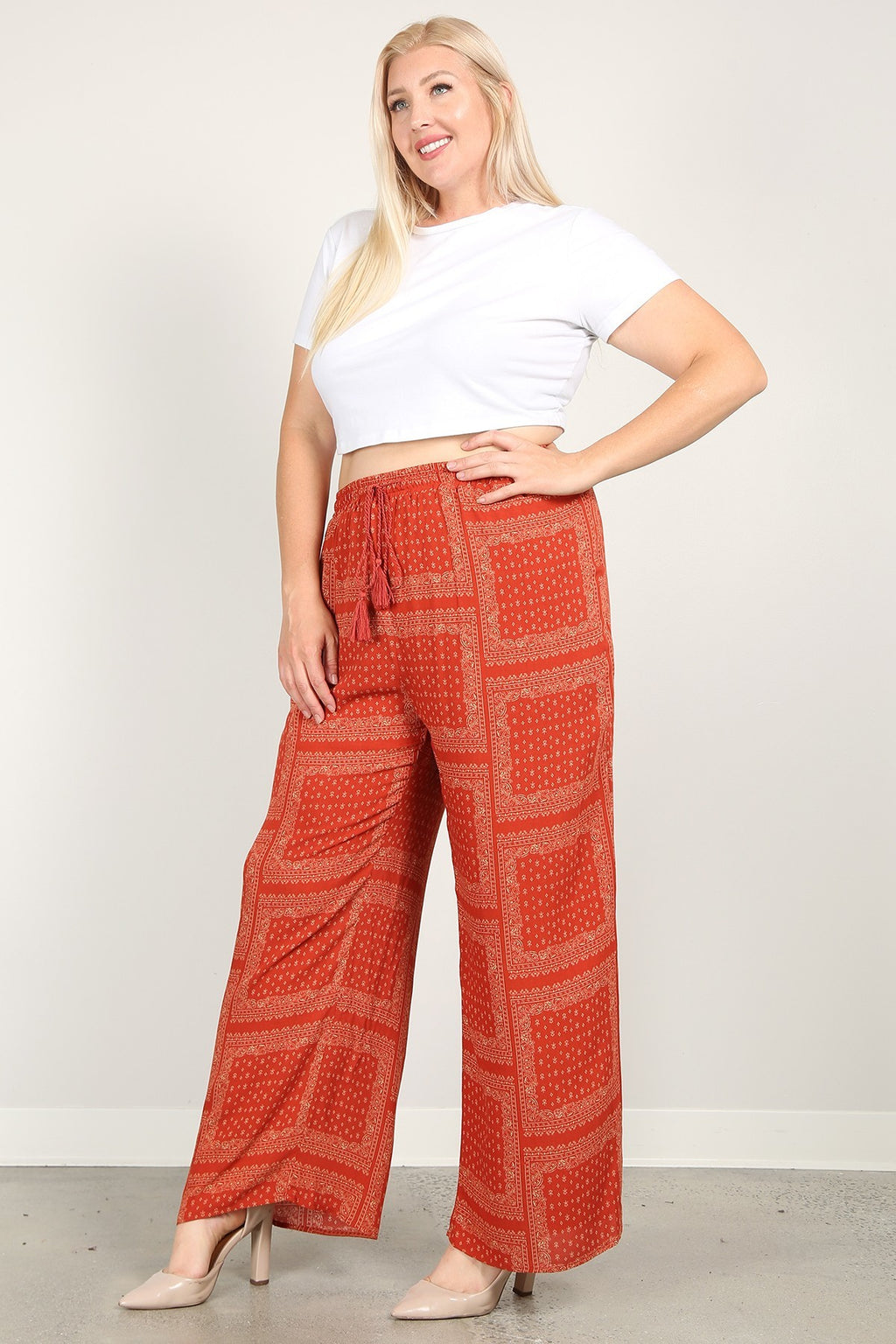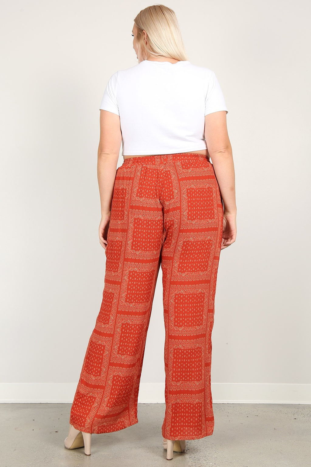 Bandanna printed, full length wide leg palazzo pants, high-waist, with elastic waist and relaxed fit