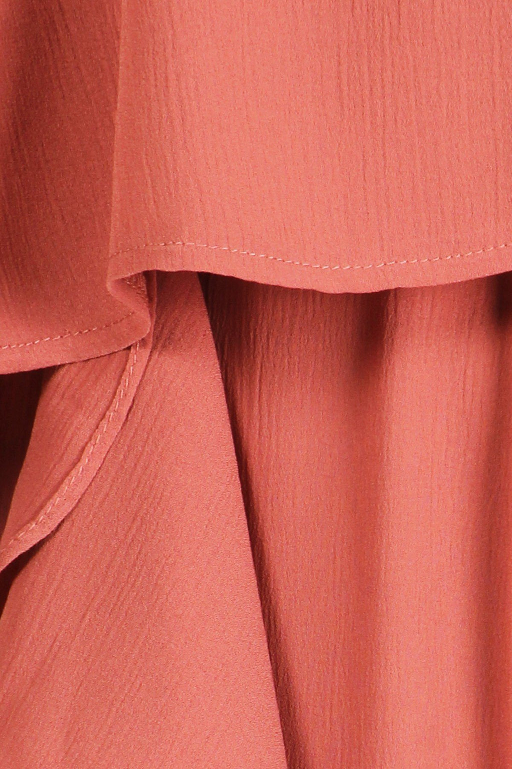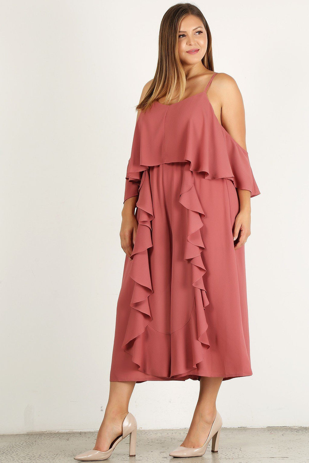 Plus size solid wide leg jumpsuit with sleeves falling at 3/4 length, ruffles, and layered bodice