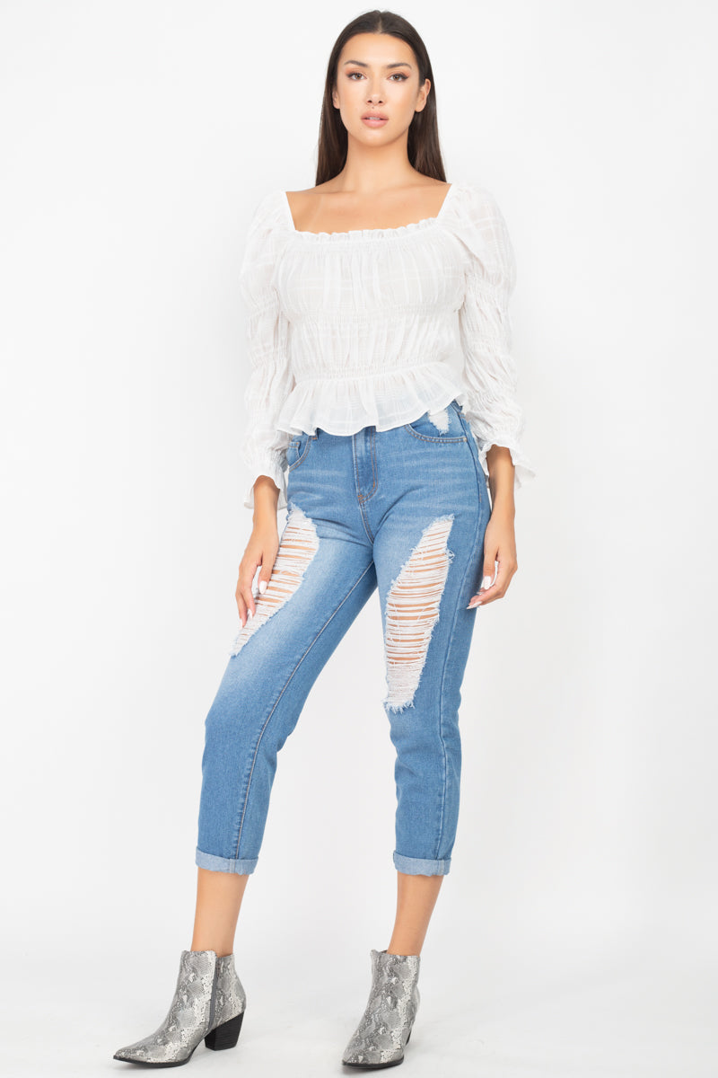 A knit top featuring a plaid pattern, smocking details, a square neckline, peplum hem, long sleeves, and a cropped length.