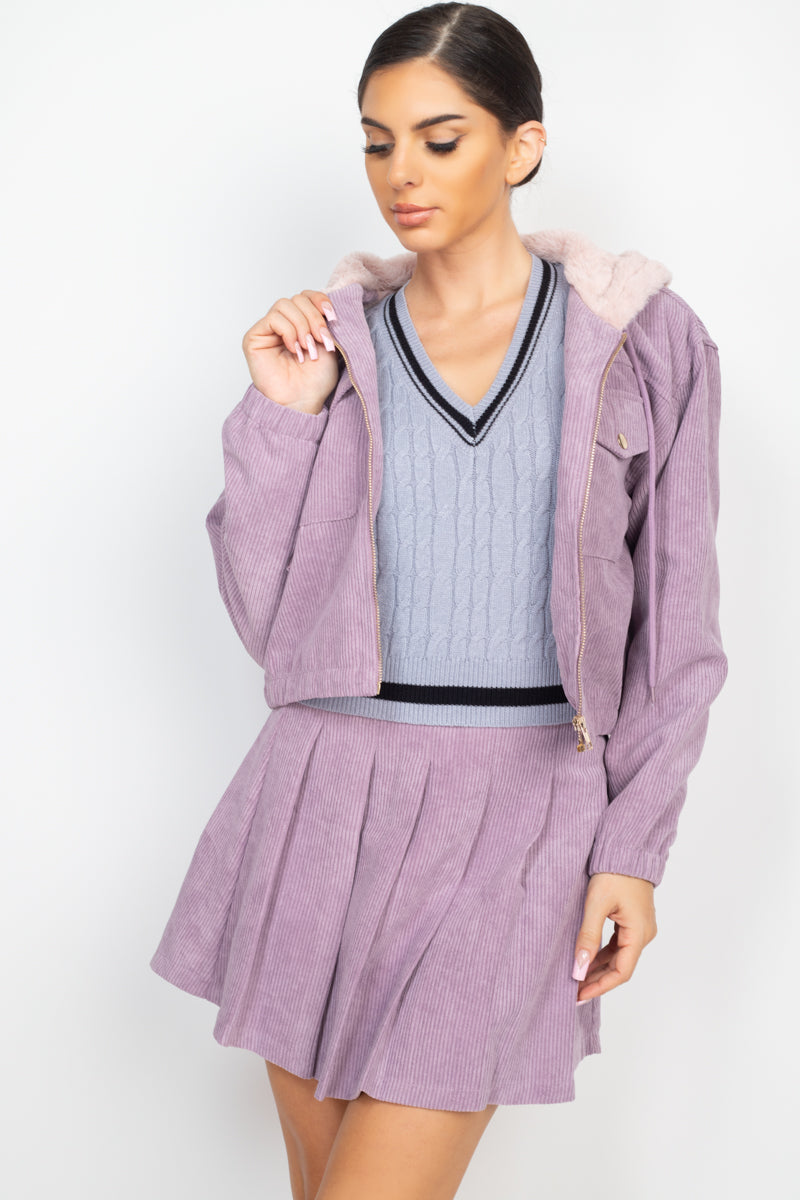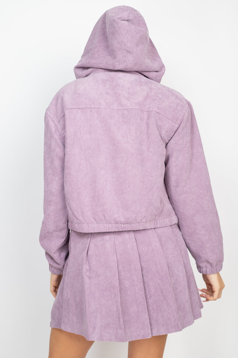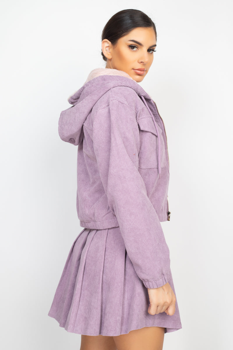 A ribbed jacket featuring a corduroy material, long sleeves, faux fur inner lining, hoodie, front zip closures, and chest flap pockets with buttons accent.