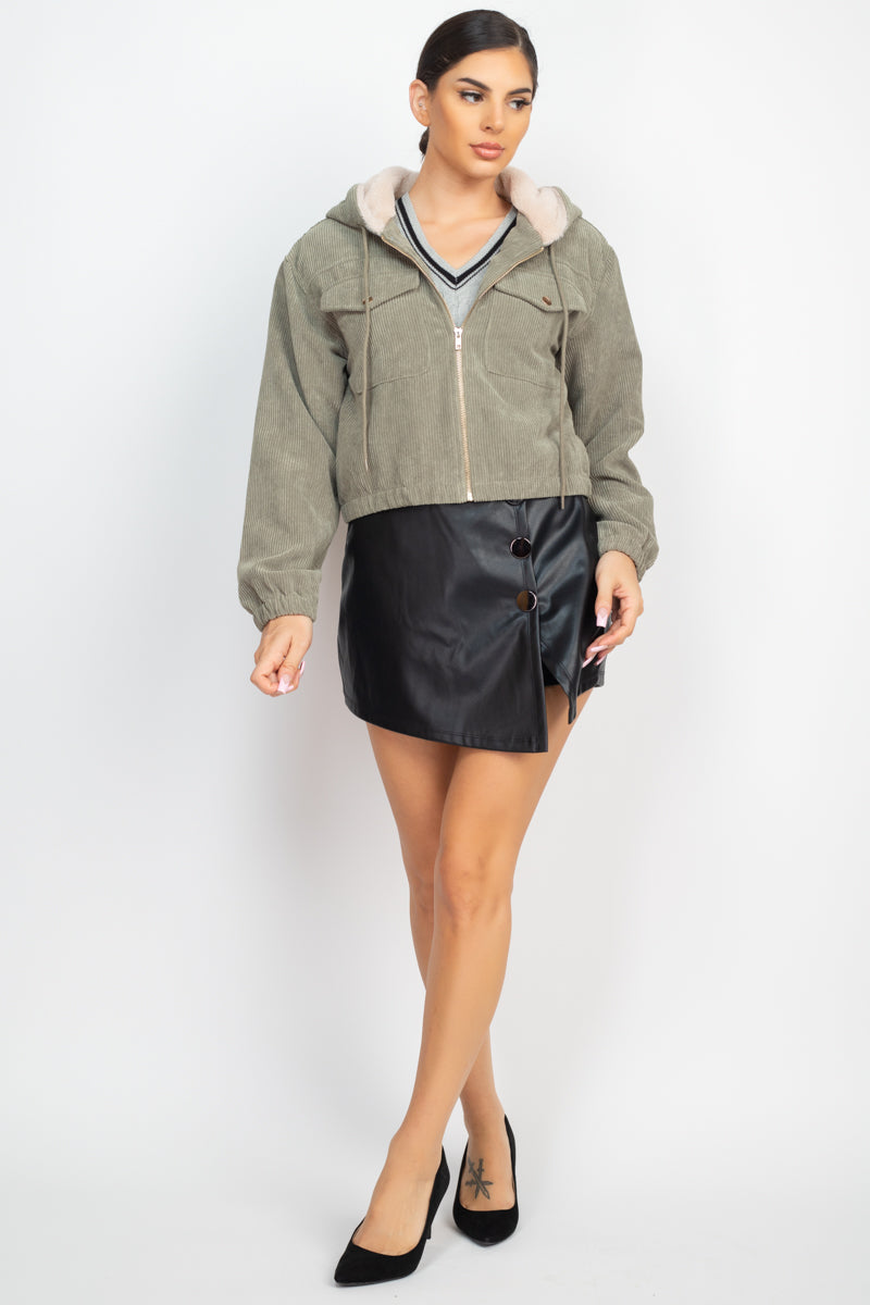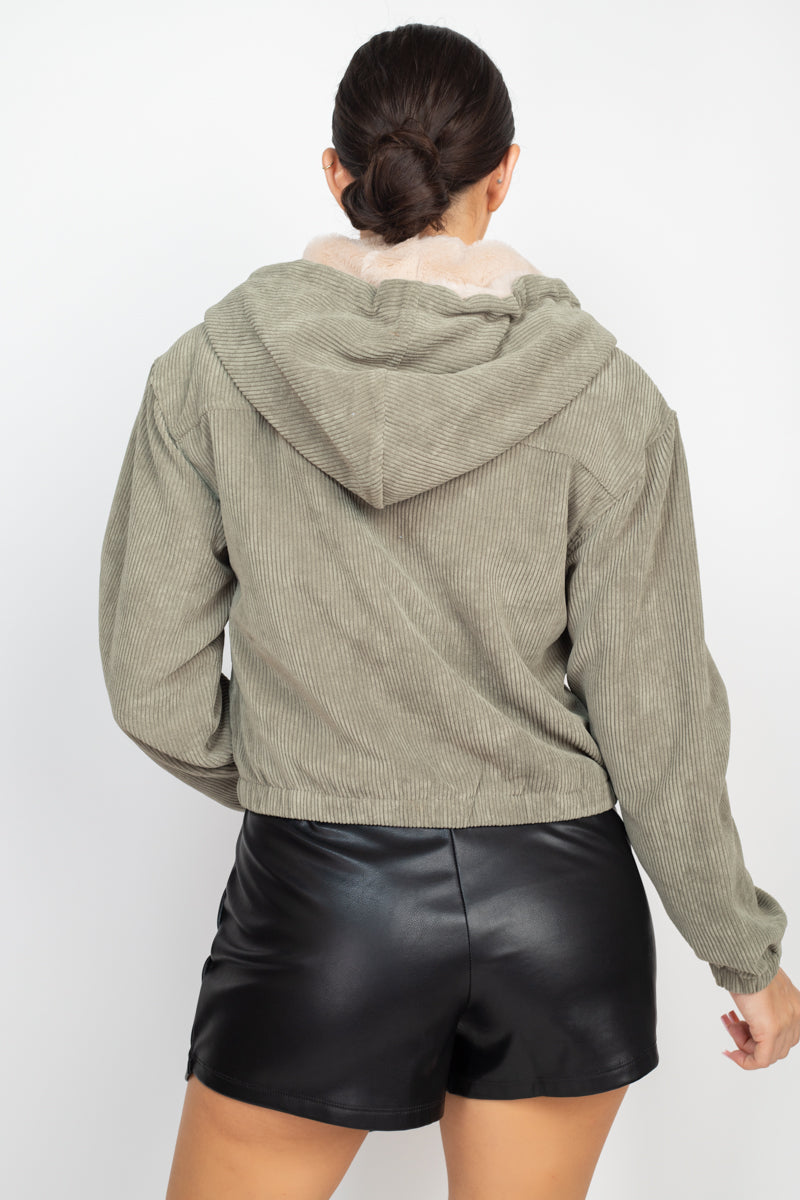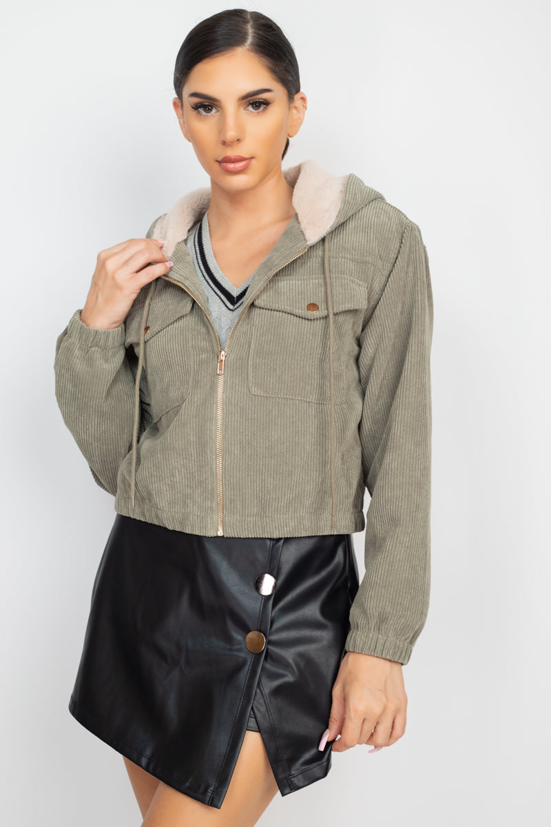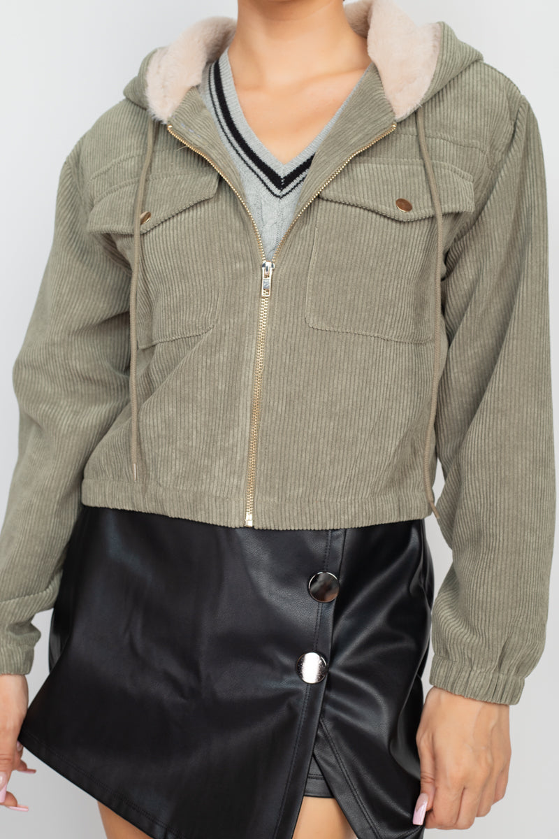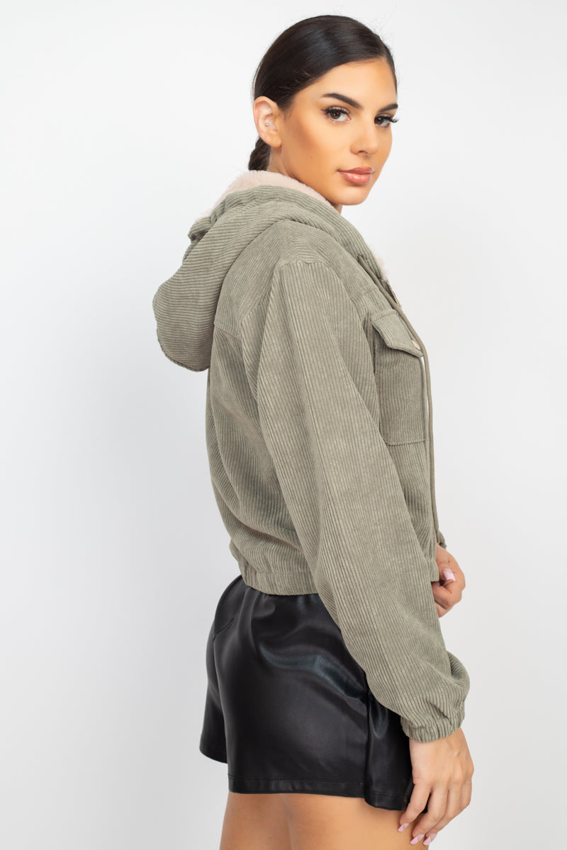 A ribbed jacket featuring a corduroy material, long sleeves, faux fur inner lining, hoodie, front zip closures, and chest flap pockets with buttons accent.
