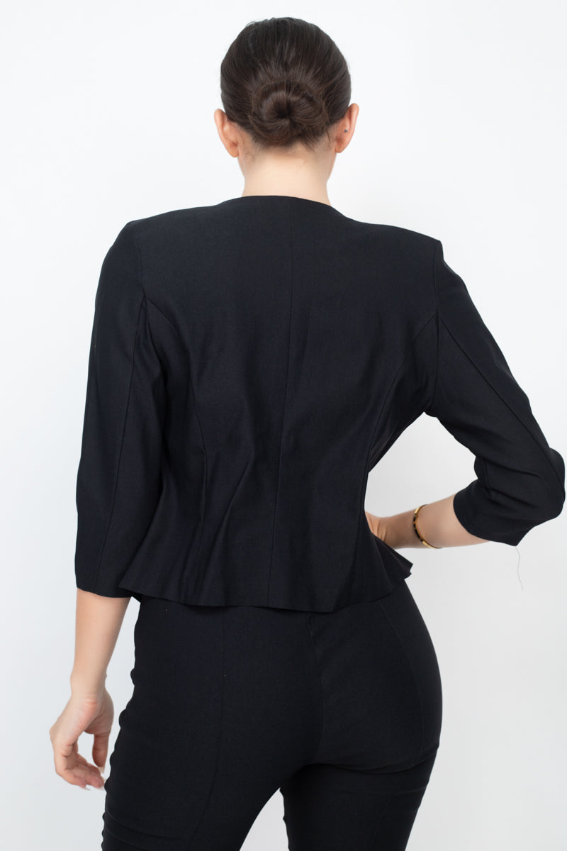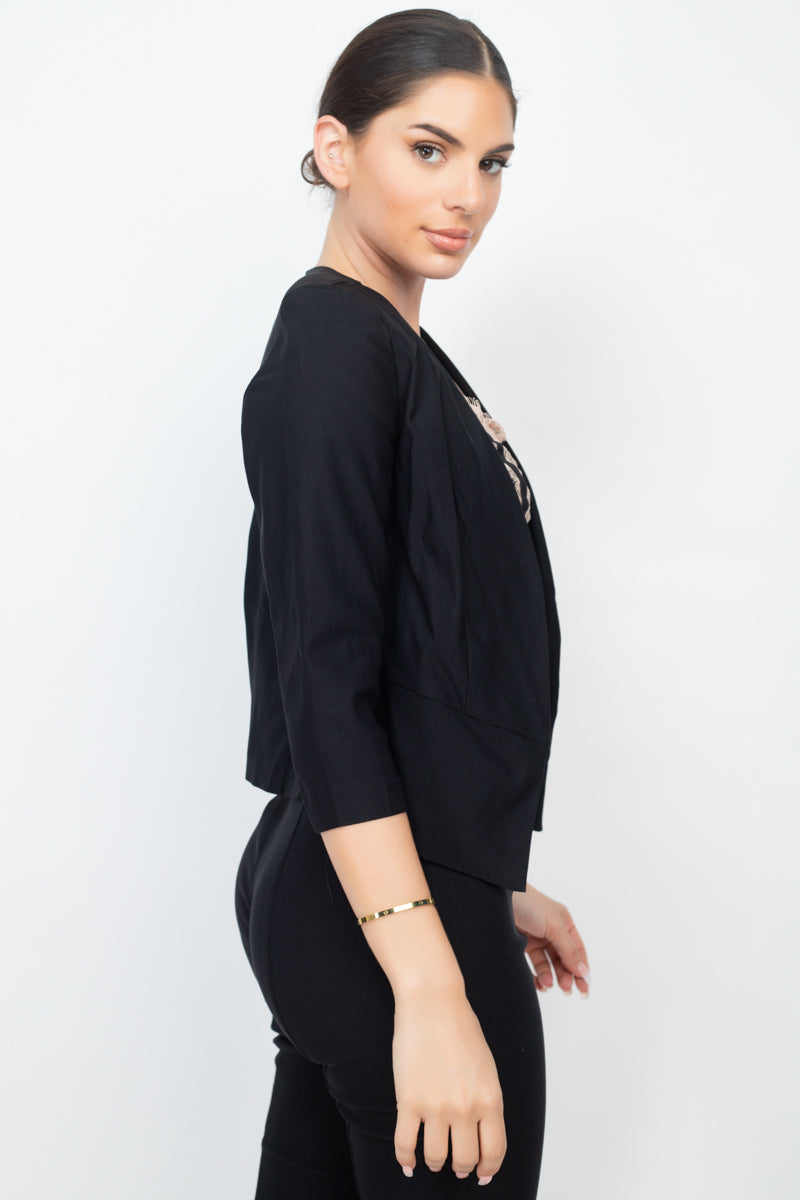 A solid blazer featuring an open front, 3/4 sleeves, and a waist-length.