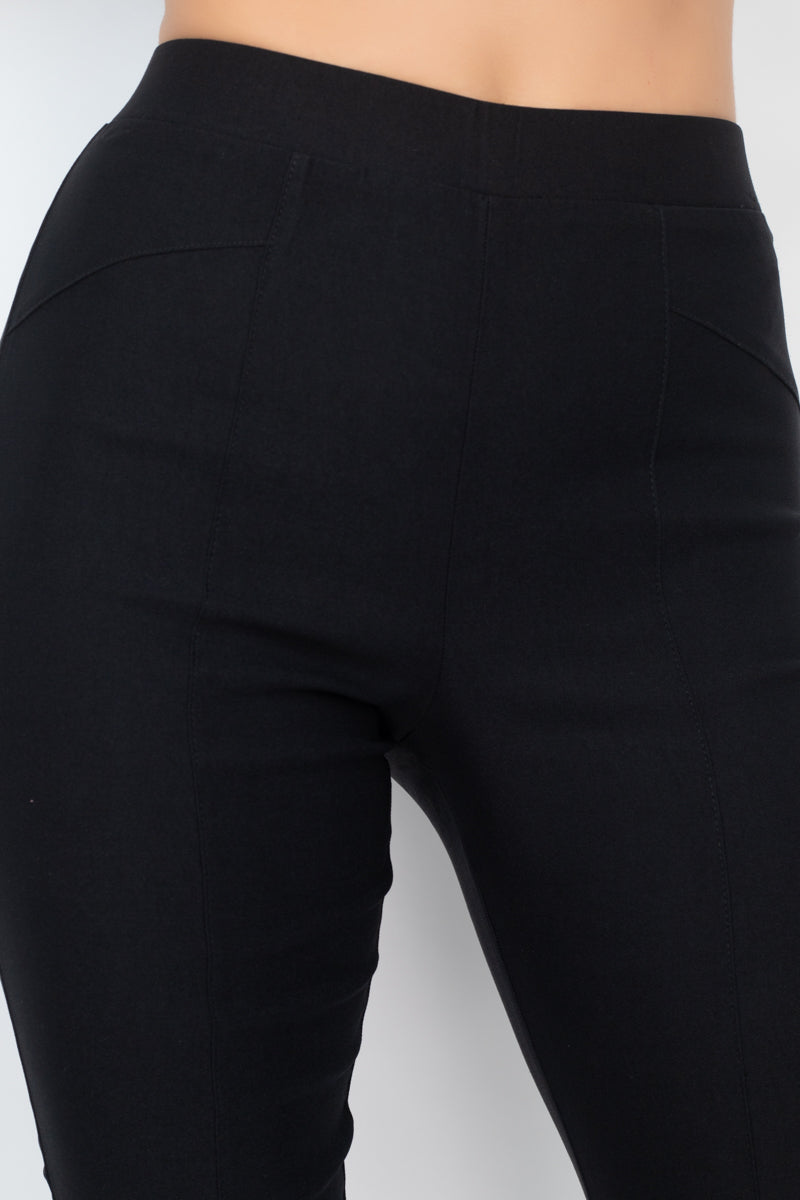 A solid pants featuring an elasticized waistband, high-rise waist, skinny leg, and a capri-length.
