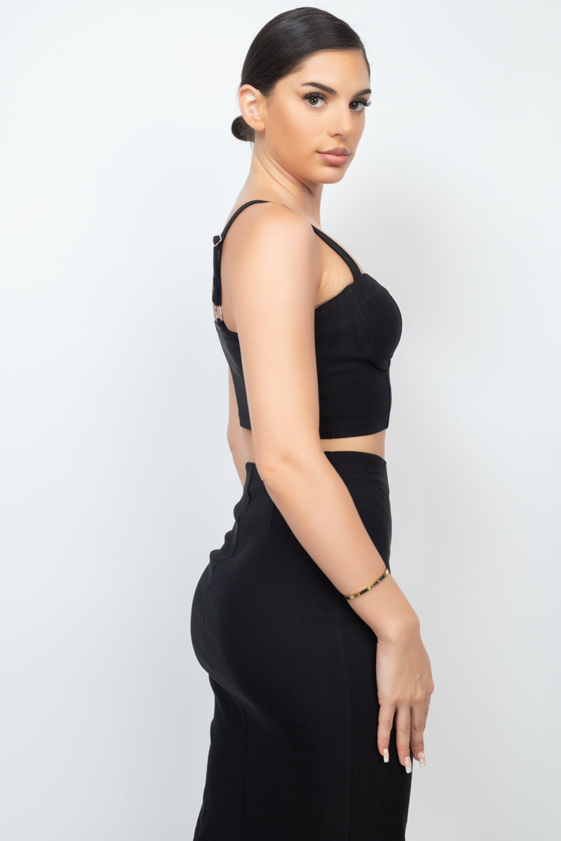 A solid tank top featuring padded bust with underwire, adjustable cami straps, princess seams, sweetheart neckline, and a side zipper closure.A solid skirt featuring a high-rise waist, an elasticized waistband, and a side slit.