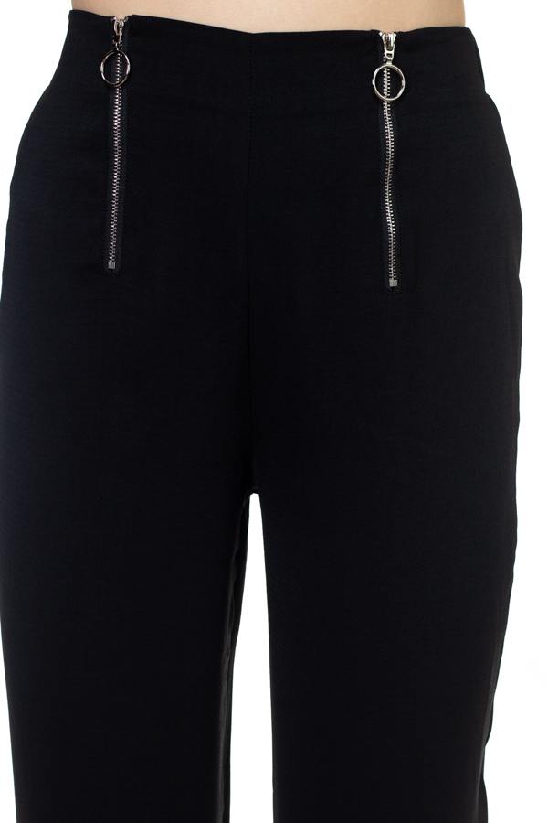 A woven pair of pants, solid color, high waist, side o-ring zipper up design, a smocked back waistline, a full length, a straight rolled hem.