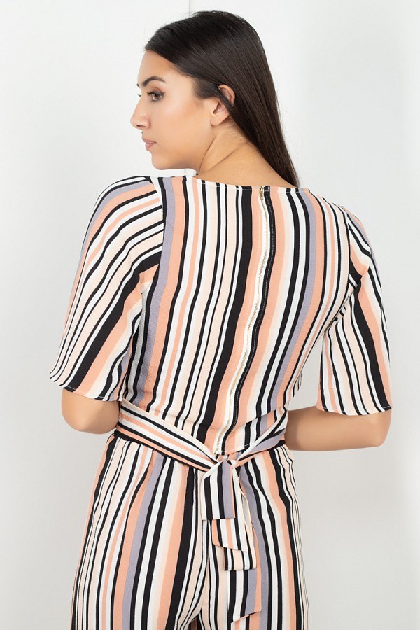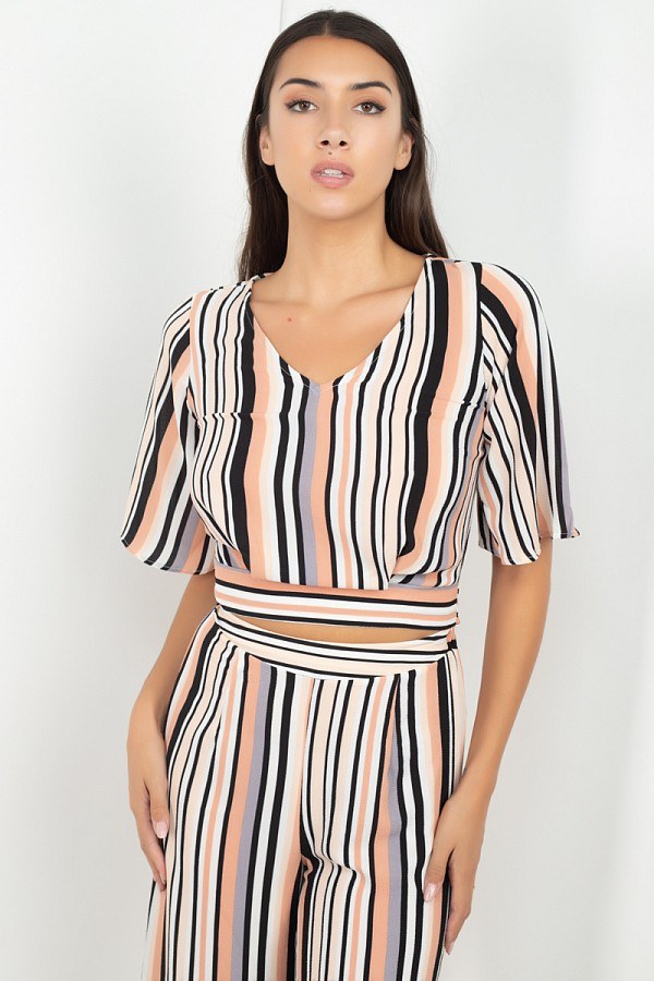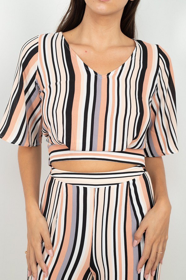 A knit top featuring all over stripes, short sleeves, a scoop neck, and a waist tie. A knit pair of pants featuring all over stripes, an elastic waist, and a wide leg fit.