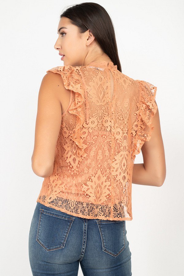 A sleeveless woven top featuring lace lace lining, a mock neckline, ruffle details, and a back keyhole.