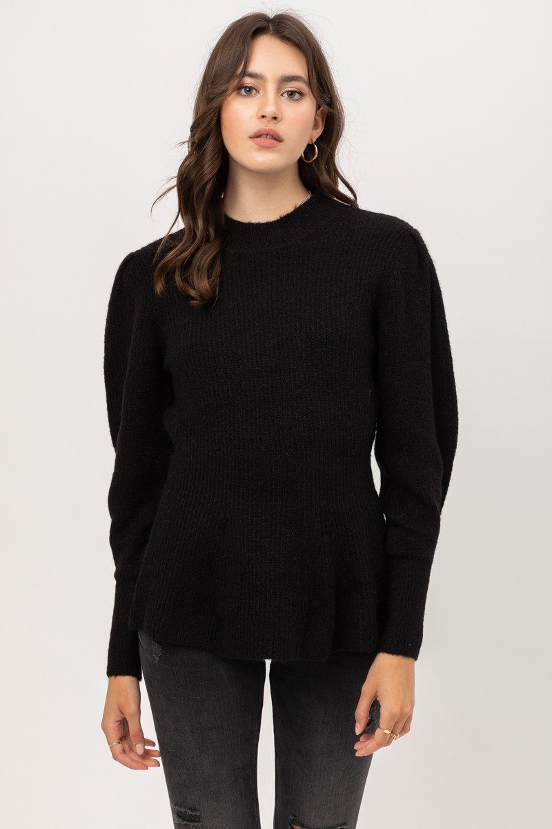 2 TONE TWEED YARN PUFF SLEEVE SWEATER