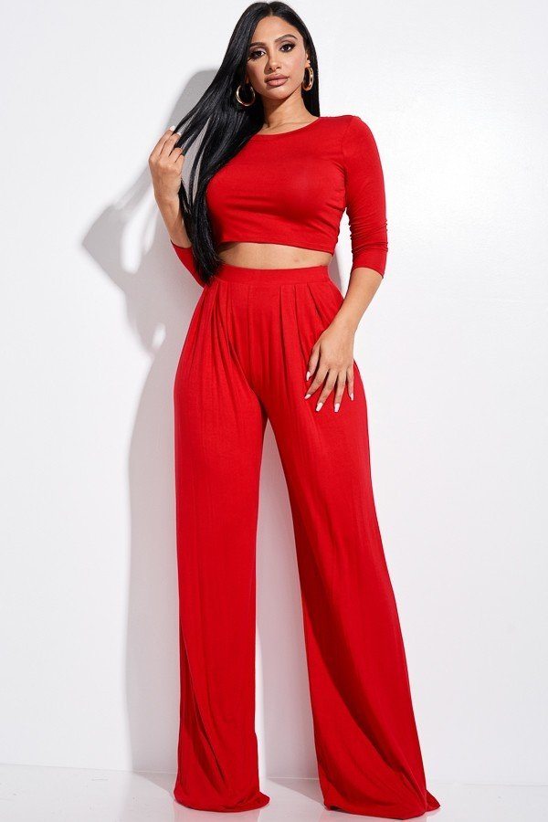 solid 3/4 sleeve top and wide leg pleated pants two piece set