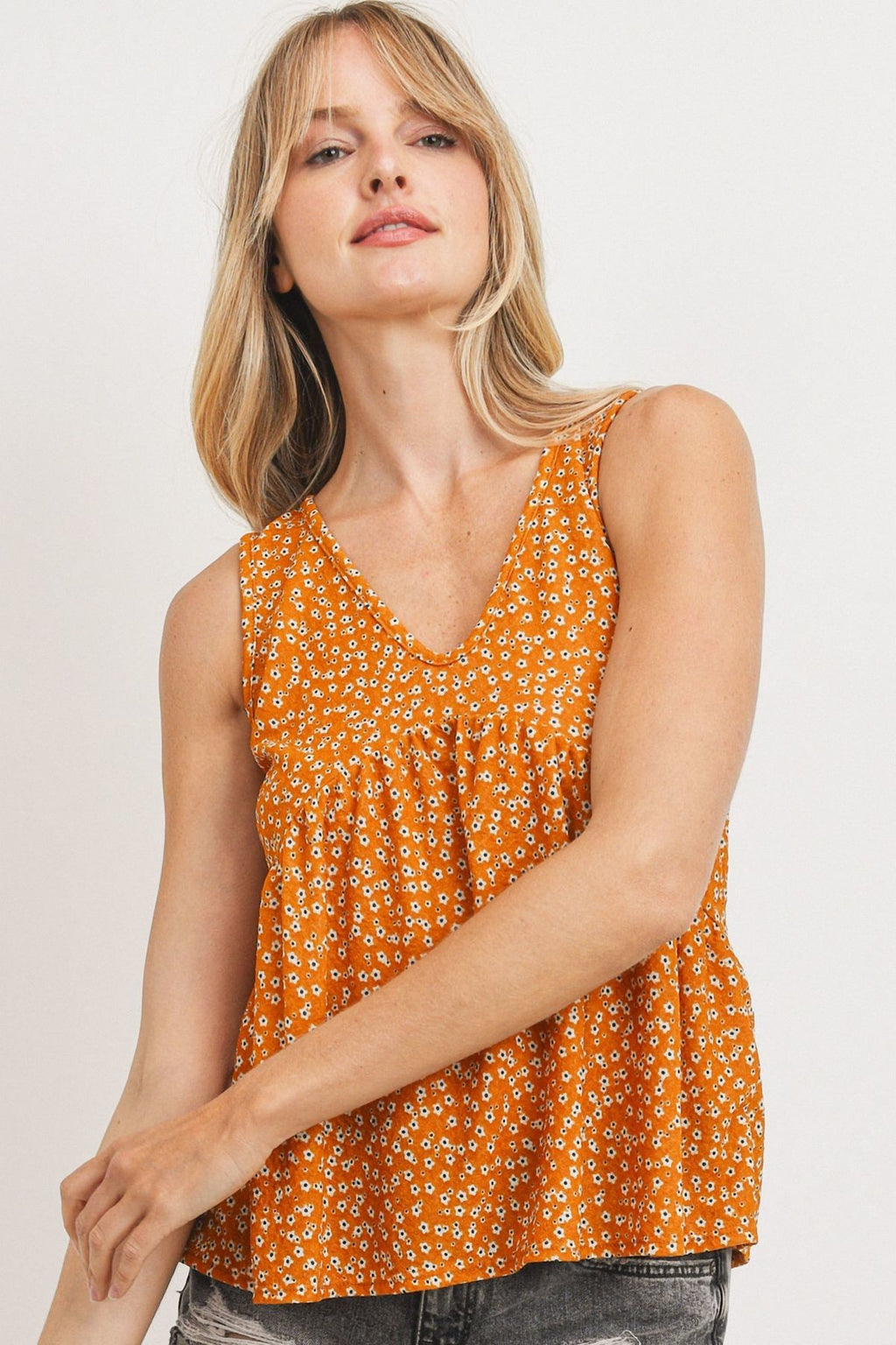 V neckline. Sleeveless. Empire cut. Floral print. Straight hem