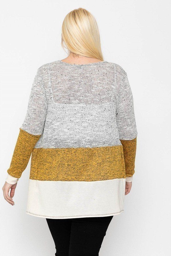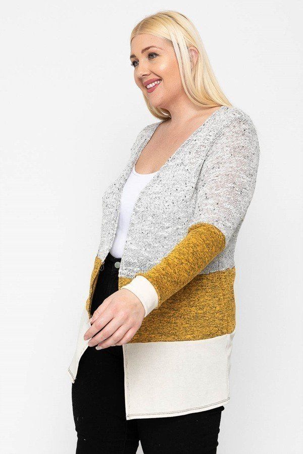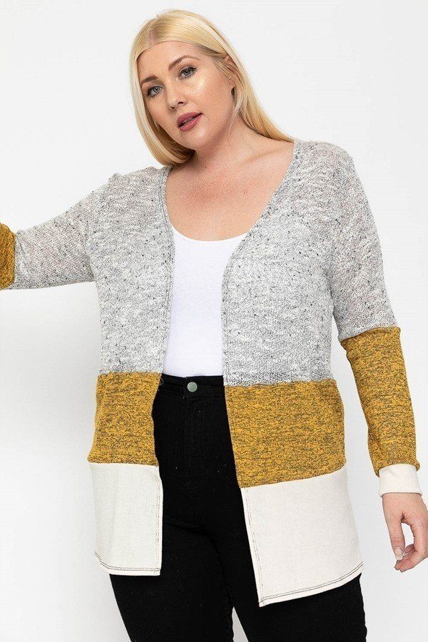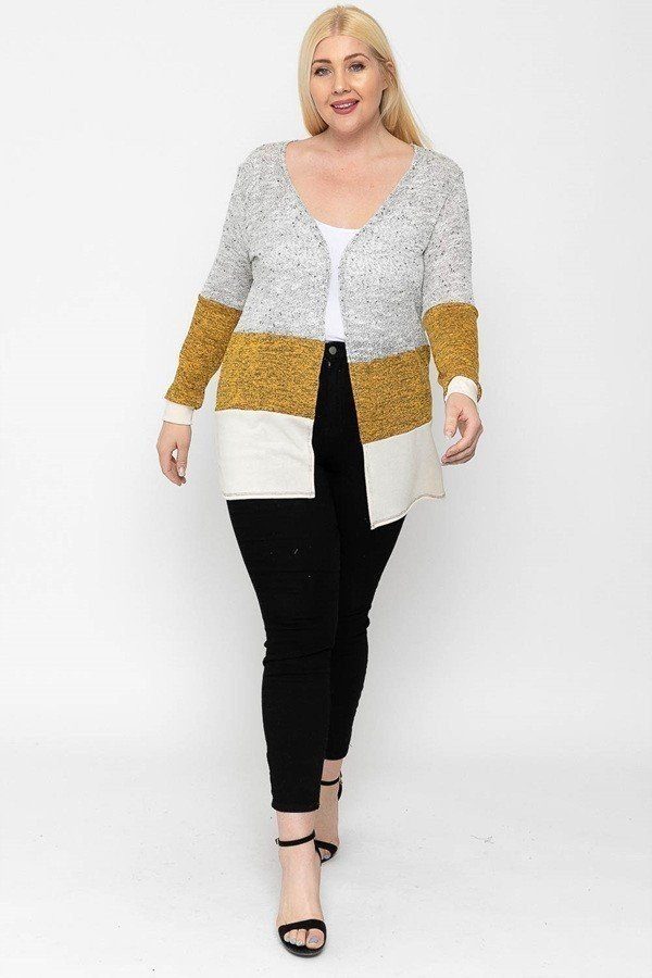 Color block, lightweight cardigan featuring three colored knits, an open front, and long sleeves.