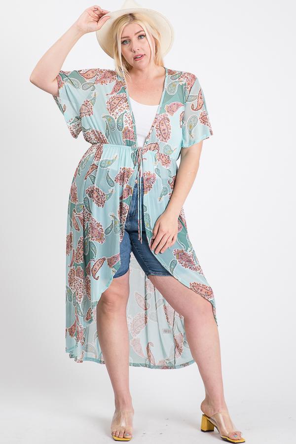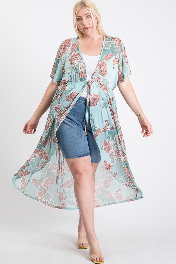 SHORT SLEEVES LONG-LINE PRINTED MESH OPEN CARDIGAN WITH ELASTIC FRONT TIE
