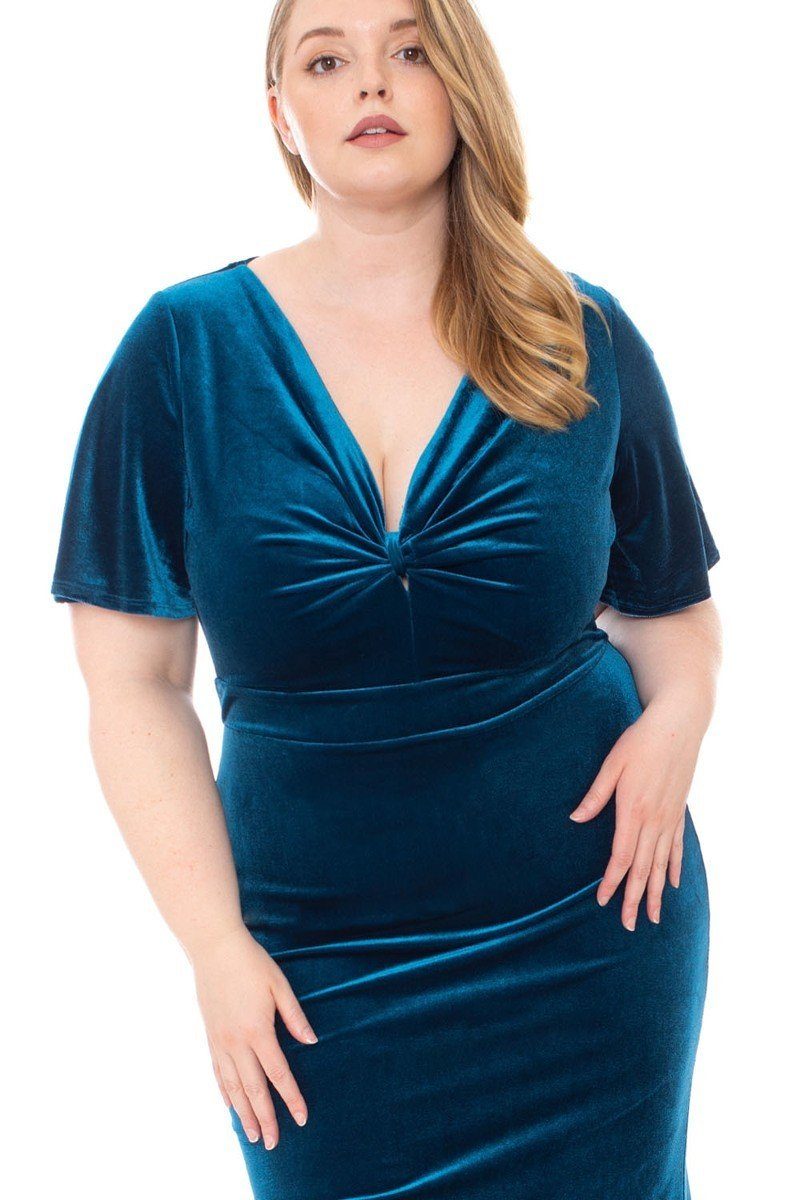 STRETCH VELVET / BOW FRONT DEEP V-NECK / RUFFLE SHORT SLEEVE / ZIPPER BACK, FLOWY BOTTOM