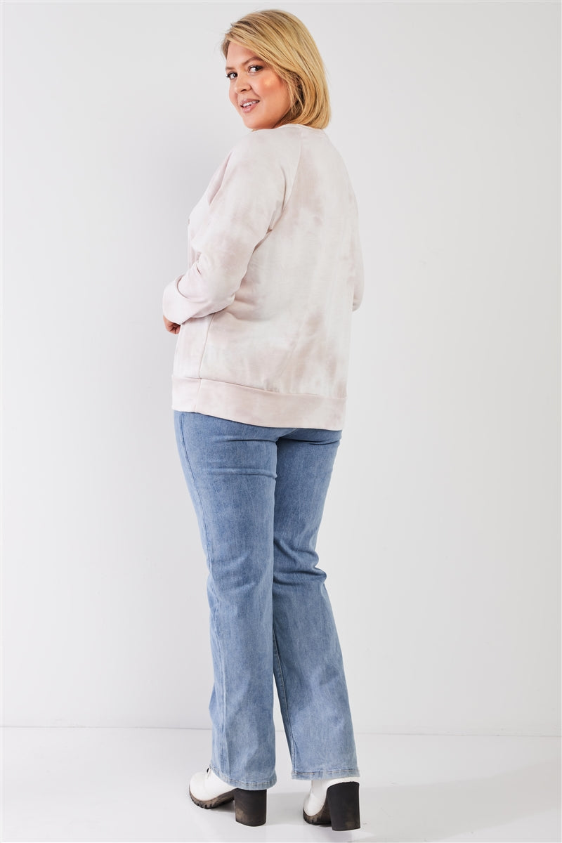 Blush and white, tie-dye bleached effect, round neckline, long sleeves, "ENJOY LIFE" affirmation graphic detail, relaxed fit, unlined, stretchy, non-sheer, soft plush reverse side of the fabric, casual, cozy, warm, comfy, loungewear, sporty, fall/winter collection