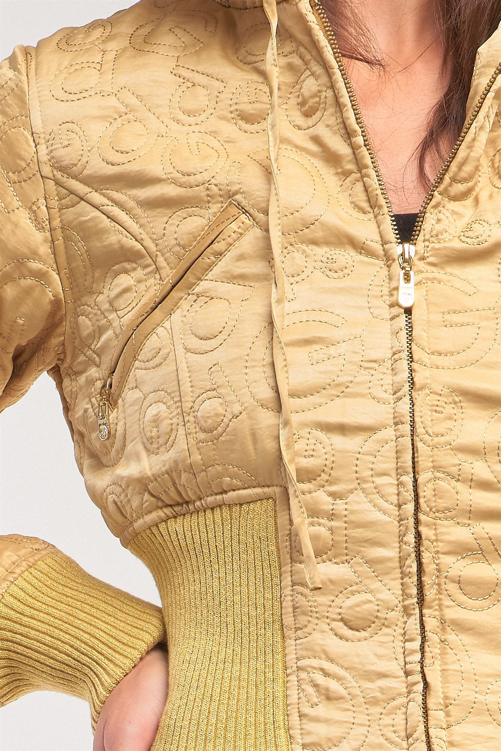 solid, letter print, long puffed sleeves with stretchy ribbed cuffs, front zipper closure, glittered corset-like narrowed ribbed stretchy waist, draw string tie hood with zipper detachable faux fur detail, two front chest zipper pockets, cropped length, tight fit, lined, semi-stretch, casual, retro vibe, flirty, sport, comfy, winter ski jacket, stylish, trendy, hot new fall/winter collection