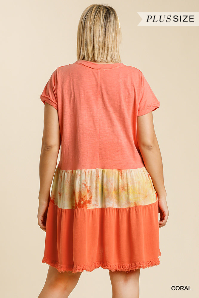 Tie Dye V-Neck Short Folded Sleeve Raw Edged Detail Dress with Fringed Hem