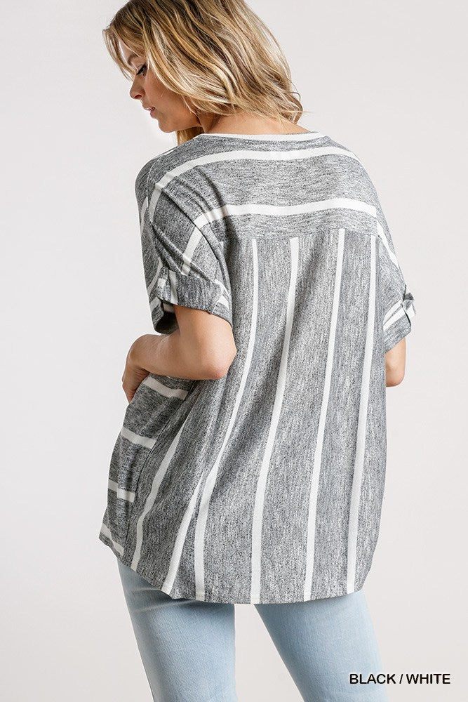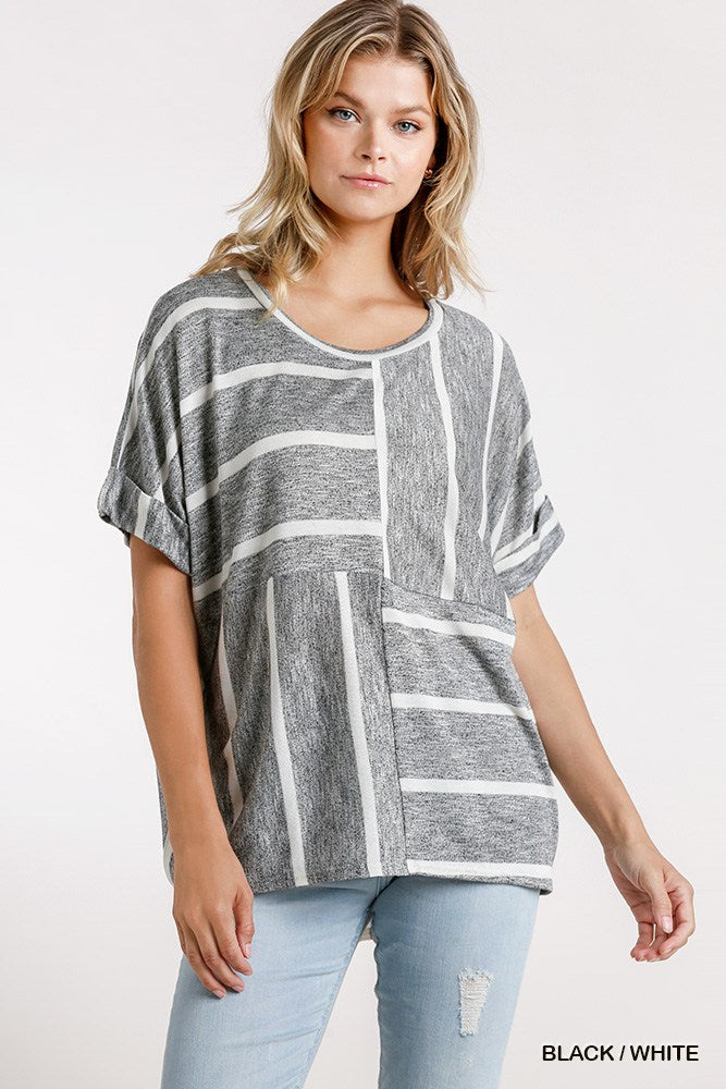 Horizontal and Vertical Striped Short Folded Sleeve Top with High Low Hem