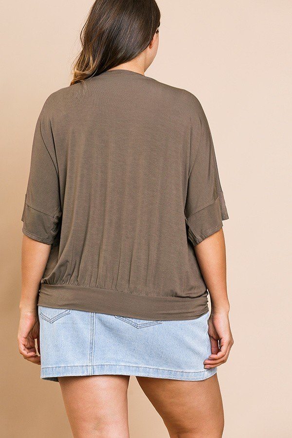 Short Bell Sleeve Basic V-Neck Top with Gathered Front Detail